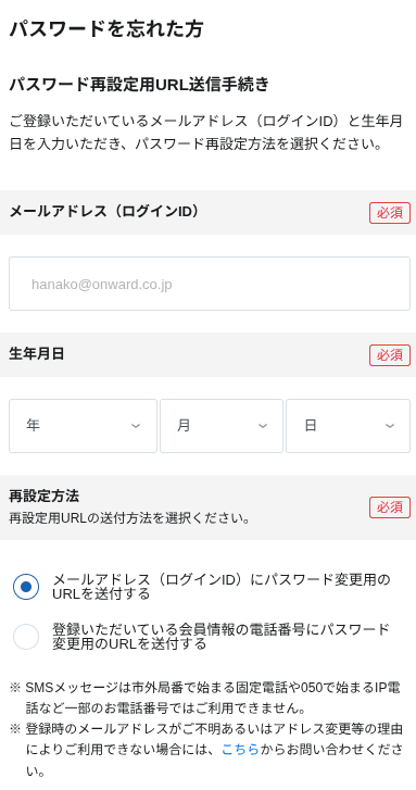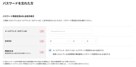 『パスワードを忘れた方』 のリンクより登録メールアドレス、生年月日、ご希望の送付方法を入力しパスワード再設定の手続きを行ってください。