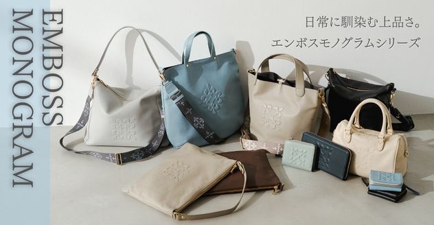 モノグラムのエンボスが印象的なデザインに、ラウンドファスナーでスマートな印象をプラス。