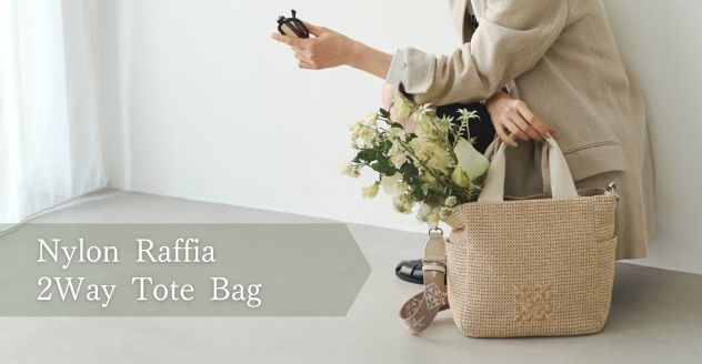 涼やかなラフィアの表情を、軽やかで扱いやすいナイロン素材で表現した2WAYトートバッグ。