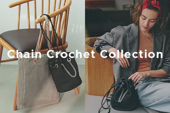 クロシェ編みの柔らかい風合いと、チェーンハンドルが大人なファッションのアクセントに。デイリーにもリゾートにも活躍する涼し気なチェーンクロシェコレクション。
