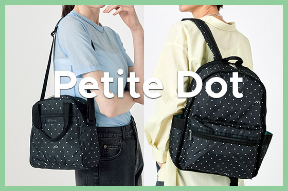 ブラック(黒)ベース×ホワイト(白)のベーシックなドット柄です。シンプルなモノトーン配色でどんなコーディネートにも合わせやすく、シーズンレスに活躍します。さりげなく入ったLeSportsacのロゴもポイント◎
