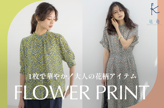 縦にフィラメント糸、横にスパン糸を使用したツイル素材。ポリエステルのイージーケア性があり、横にスパン糸を使用することで合繊感を和らげ天然タッチを表現しました。捺染プリントで裏面まで色が浸透しているので高級感があります。軽く透けにくいのも特徴。5色使いの抽象的なミニフラワープリントはカラーに深みがありながらスタイリングの幅の広さが魅力です。