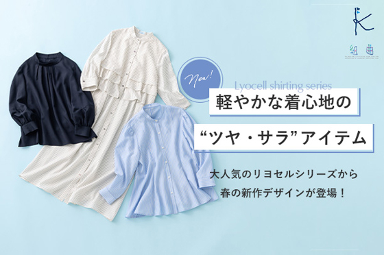 リヨセルは、繊維の断面が丸いためソフトで滑らかな肌触りの風合いとしなやかでドレープ性が特長です。糸質からの上品でまるみのある光沢感と軽く吸湿性もあり、透けにくく肌触りも抜群です。エレガントさは残しつつ、ナチュラルさとリラックス感を両立させた大人の女性に似合う表情に仕上げています。再生繊維であるリヨセル100%素材で、環境に優しいエコロジカルな繊維です。オリジナル柄のストライプはカラーで柄デザインを変えています。これからの季節に嬉しい接触冷感機能付きです。