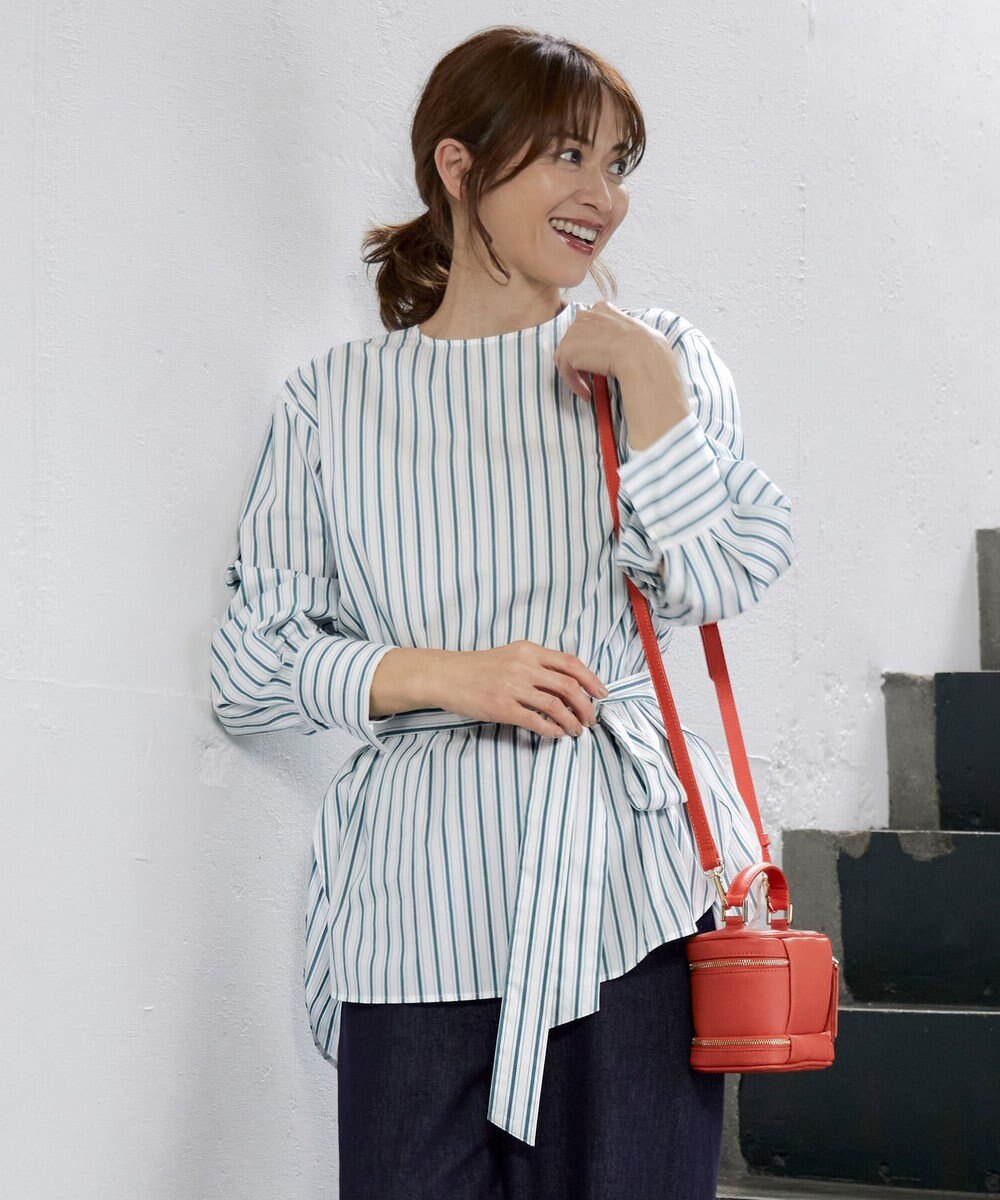 クルーネックのチュニック丈ブラウスです。腰周りが隠れるチュニック丈で、裾をテールのデザインにすることで女性らしく軽やかに着て頂けます。パンツやストレートシルエットスカートと合わせやすく、付属のベルトでウエストをマークしたスタイリングも楽しんでいただけます。ストライプ柄2色、無地2色の計4色展開です。