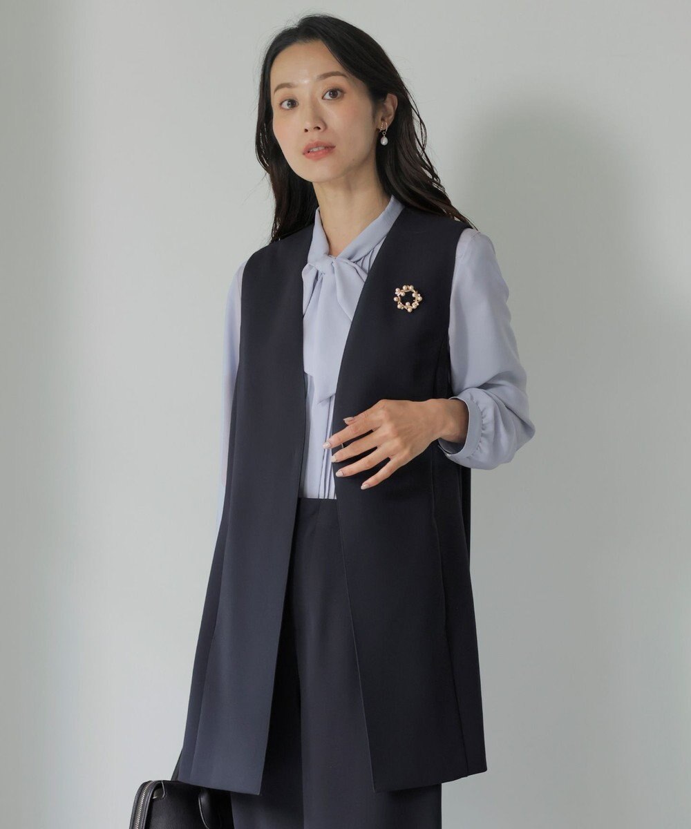 上品な雰囲気に仕上げた、トレンド感のあるジレ。すっきりとしたIラインシルエットが気になる腰まわりを隠してくれるため、ワードローブに1枚あると重宝します。シャープな印象のVネックで着回しやすく、気温に合わせてインナーのトップスを変えることでロングシーズン活躍。実用的なポケット付きで、両サイドにスリットを入れて動きやすく仕上げました。同シリーズのパンツと合わせたきちんと感のある着こなしはもちろん、単品使いもできるアイテムで、旬な通勤スタイルが完成します。背抜き仕様です。