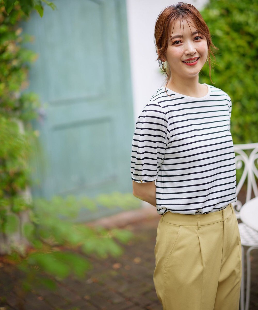ANY SIS 【汗ジミ防止・UVケア】アーモンドスリーブ カットソー オフホワイトボーダー