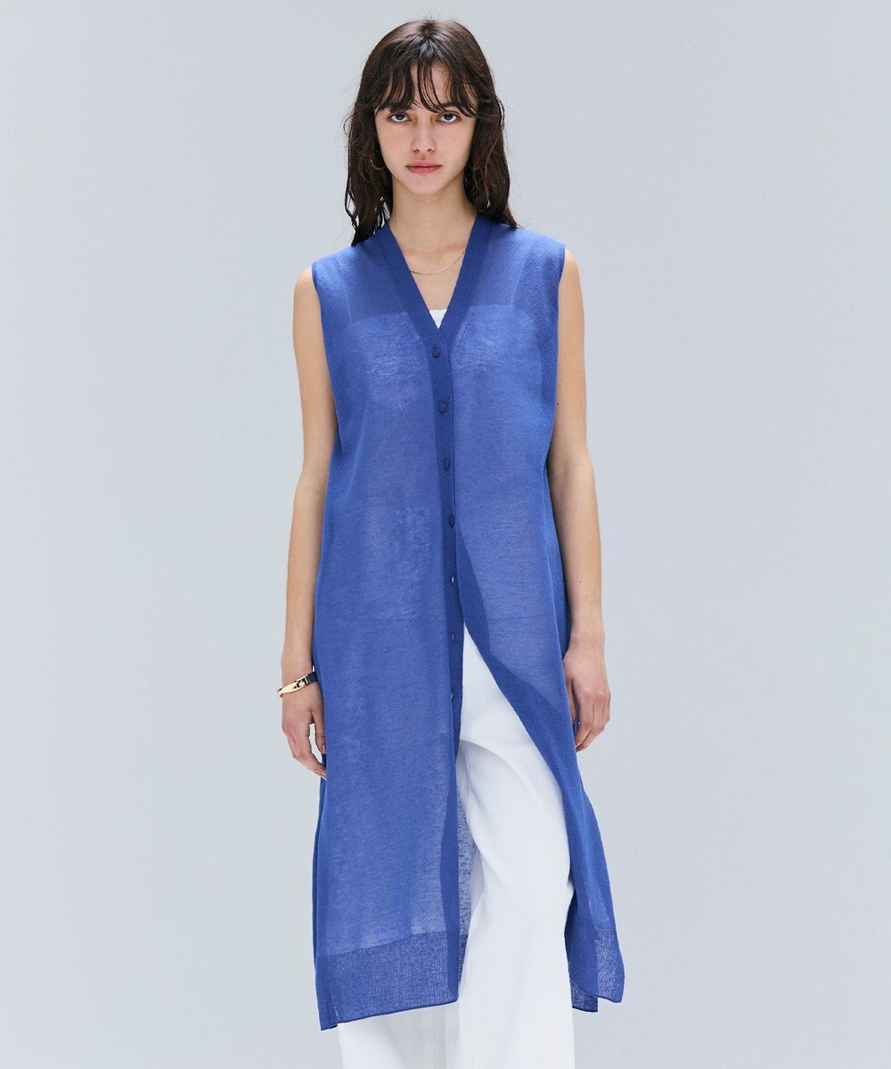 ほんのり透けるシアーな風合いが魅力のロングジレカーディガン。深めのVネックが顔周りをすっきりと見せ、ロング丈ながらも軽やかさのあるシルエット。サイドスリット入りでが足さばきが良く、パンツやスカートとのレイヤードスタイルも自在にお楽しみいただけます。フロントボタンを開ければジレとして、全て閉じればロングカーディガンとしてアレンジでき、裾に向かって緩やかに広がるラインがエアリーで女性らしい雰囲気に。カットソーやブラウスにさらりと羽織るだけで、こなれたスタイリングが完成する着回し力の高い1枚です。