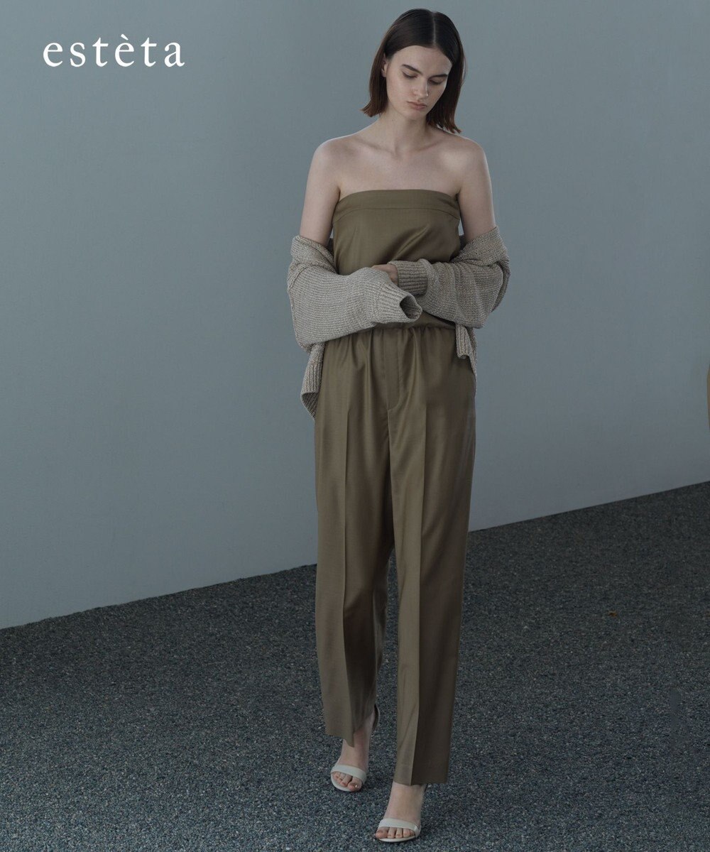ビスチェとパンツをドッキングした、エステータ初のオールインワンサロペット。ビスチェはウエスト位置でブラウジングするようにデザインされています。パンツ部分はワイドで裾に向かってテーパードされたシルエットです。裏無し仕様で暑い時期にも重宝します。ジャケットをあわせてきれいめにも、カットソーや旬なラメ感のあるカーディガンをあわせてカジュアルなスタイルにも、着回しを楽しめるアイテムです。オンオフ使いやすいシックなブラック(#005)、洒落感のあるカーキ(#054)の2色展開です。
