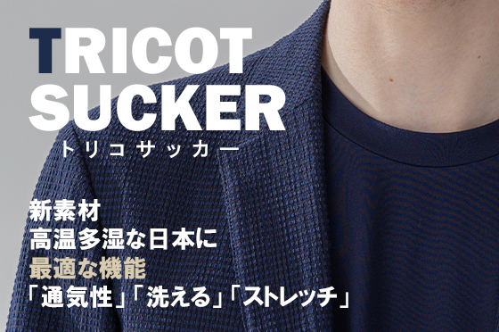 織物の様に見えて、経編トリコットの技術を応用させて作成したサッカー素材で抜群なストレッチ性を持つ。多数の孔がある組織で構成されているので、通気度が高く、高温多湿な日本に適した機能素材。