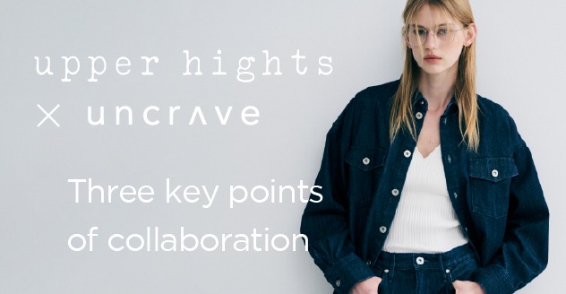 毎シーズン人気のupper hights×uncraveコラボデニムシリーズです。今季のパンツはuncraveで定番になりつつあるTHE SISTER型。ワイドシルエットと高めのウエスト位置がポイントです。リンスカラーにしたことで、よりトラウザーらしいキレイ目で大人っぽい雰囲気に仕上げました。今までのTHE SISTERとは一味違う上品な印象のデニムパンツです。