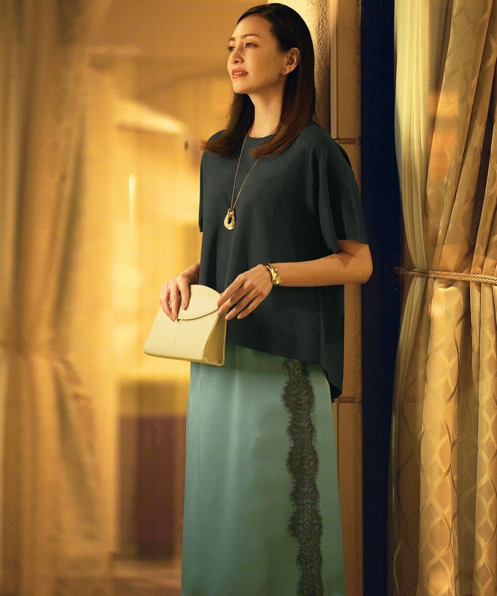 すとんと落ちるサテン素材のナロースカートです。裾と脇にスカラップ付きレースを刺繍付けしているデザインが特徴です。1枚でコーディネートの主役になる、エレガントでモードなスカートです。ウエストは総ゴムなので着心地も良く、トップスを選ばず合わせやすい上品なレングスに仕上げています。