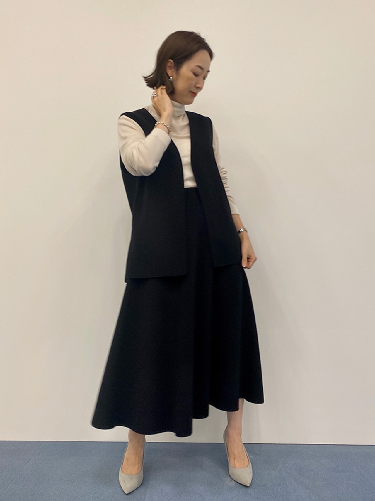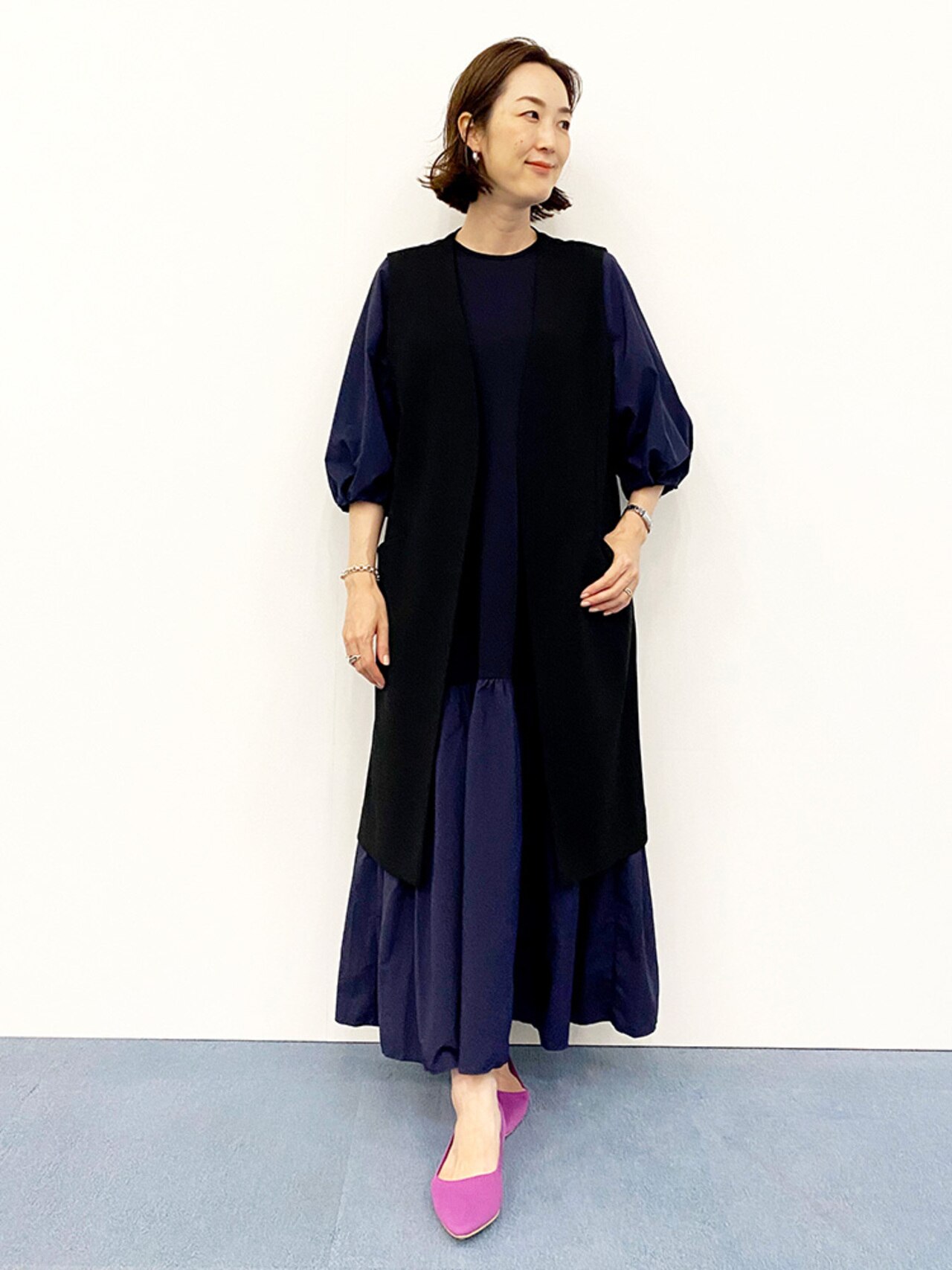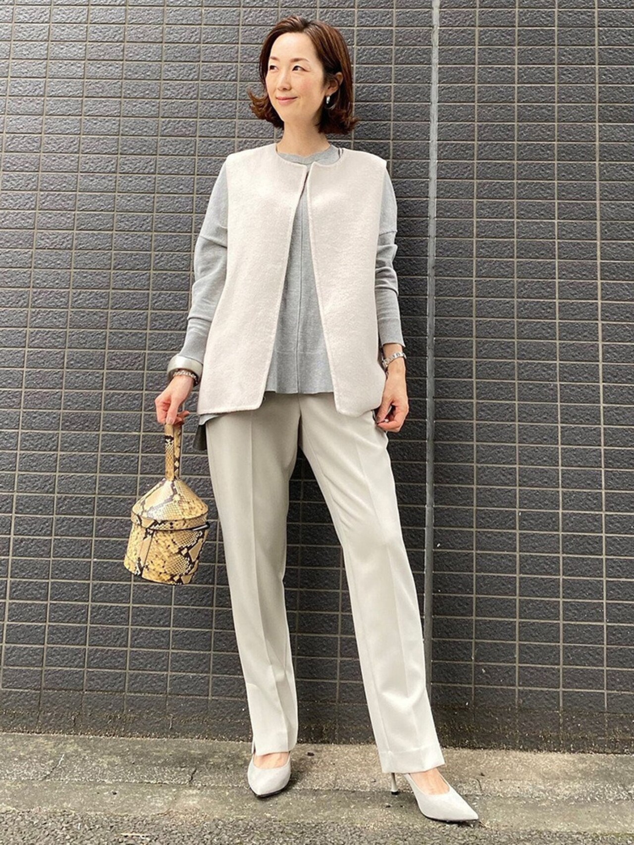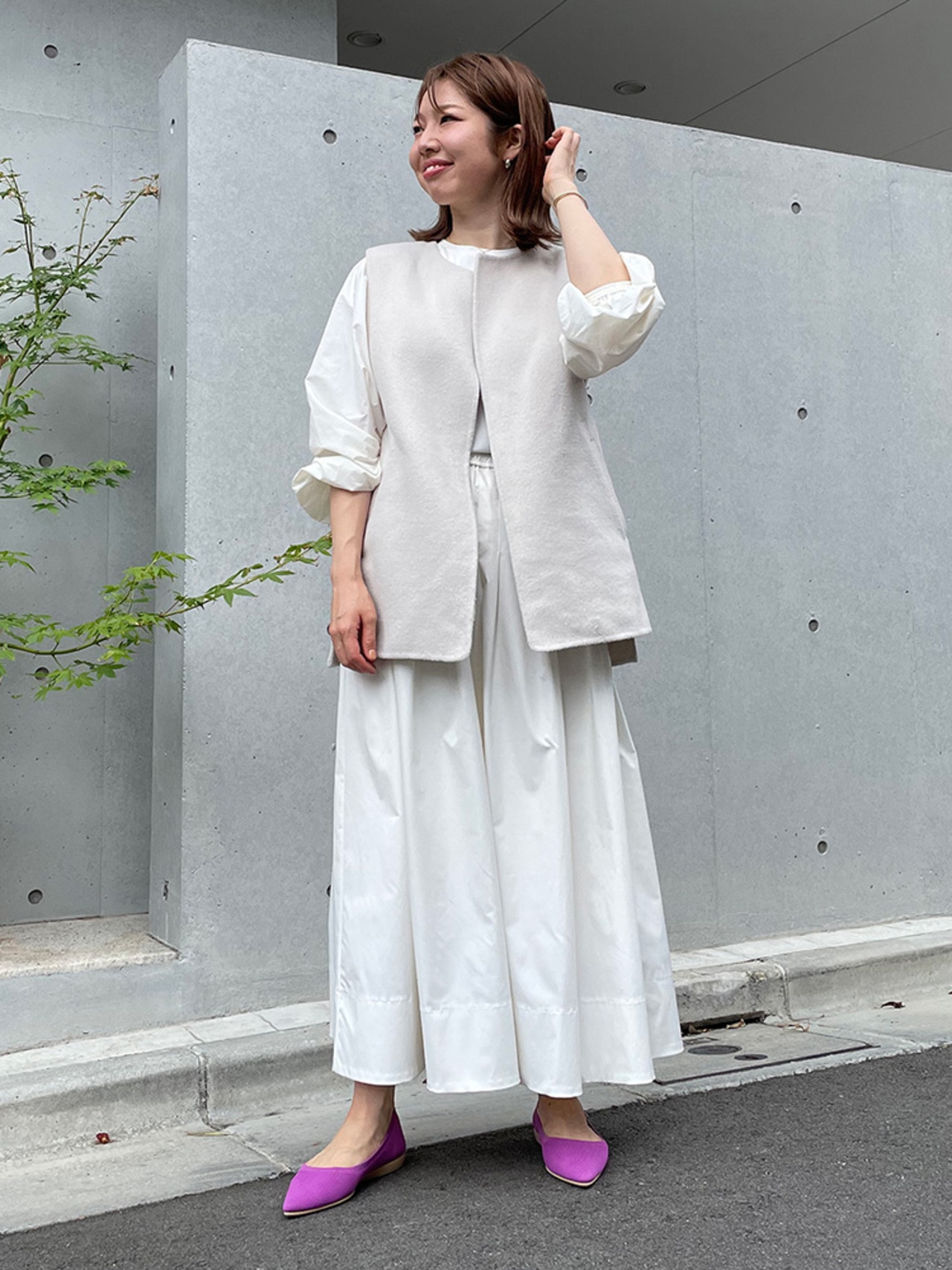 2枚の布を1枚にしたリバー仕立てのジレ。ポケット付きでアウターとして使え、真冬はアウターのインにも着れる薄さが魅力です!上品な雰囲気があるのでさっと羽織るだけでカジュアルなコーデもワンランクUP!