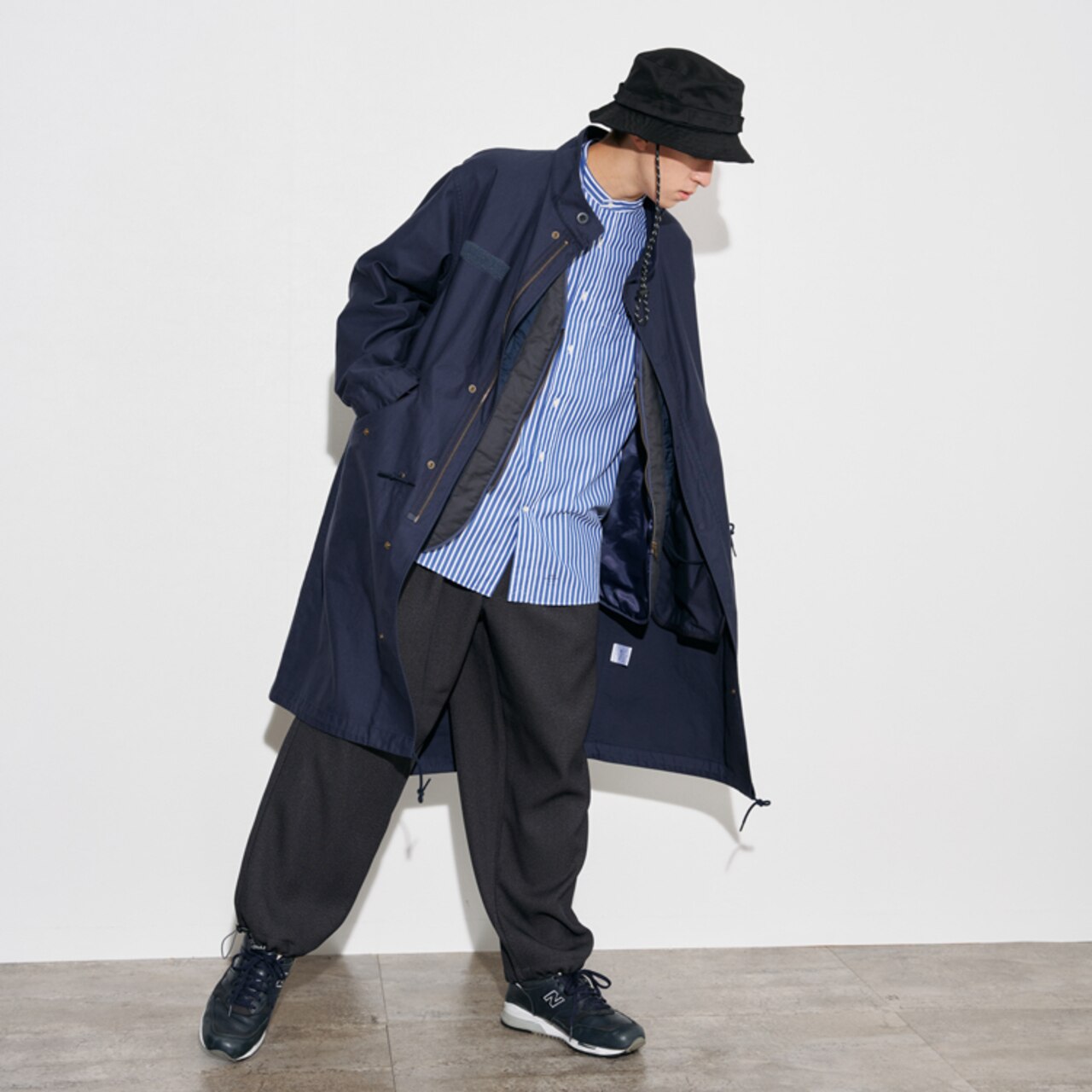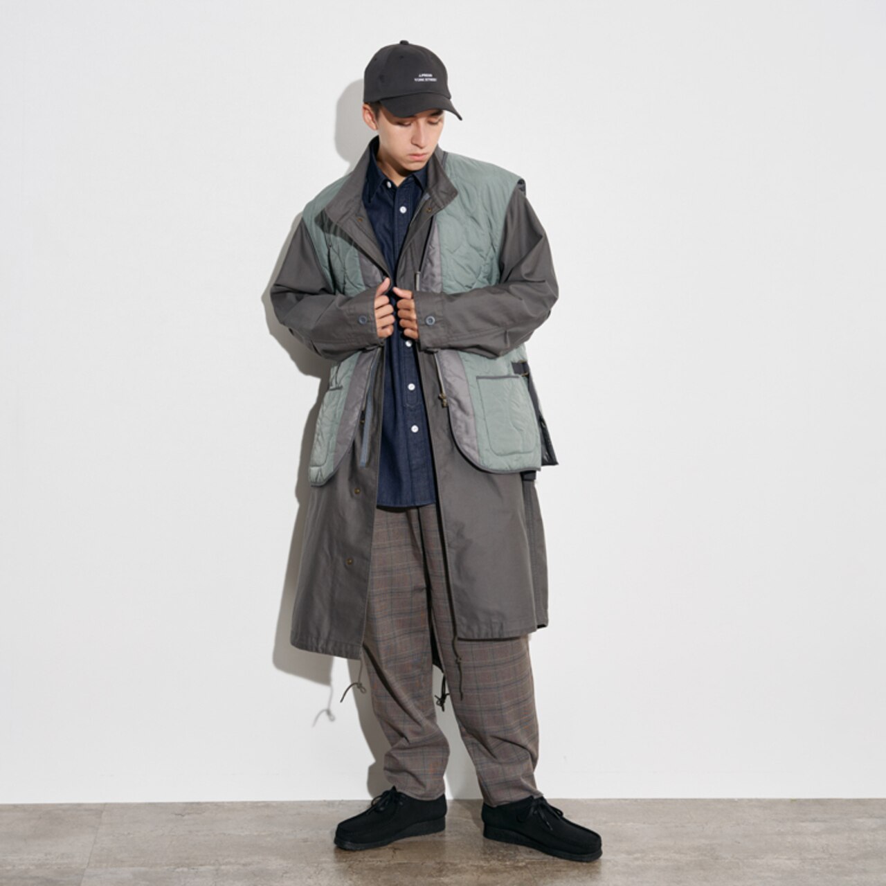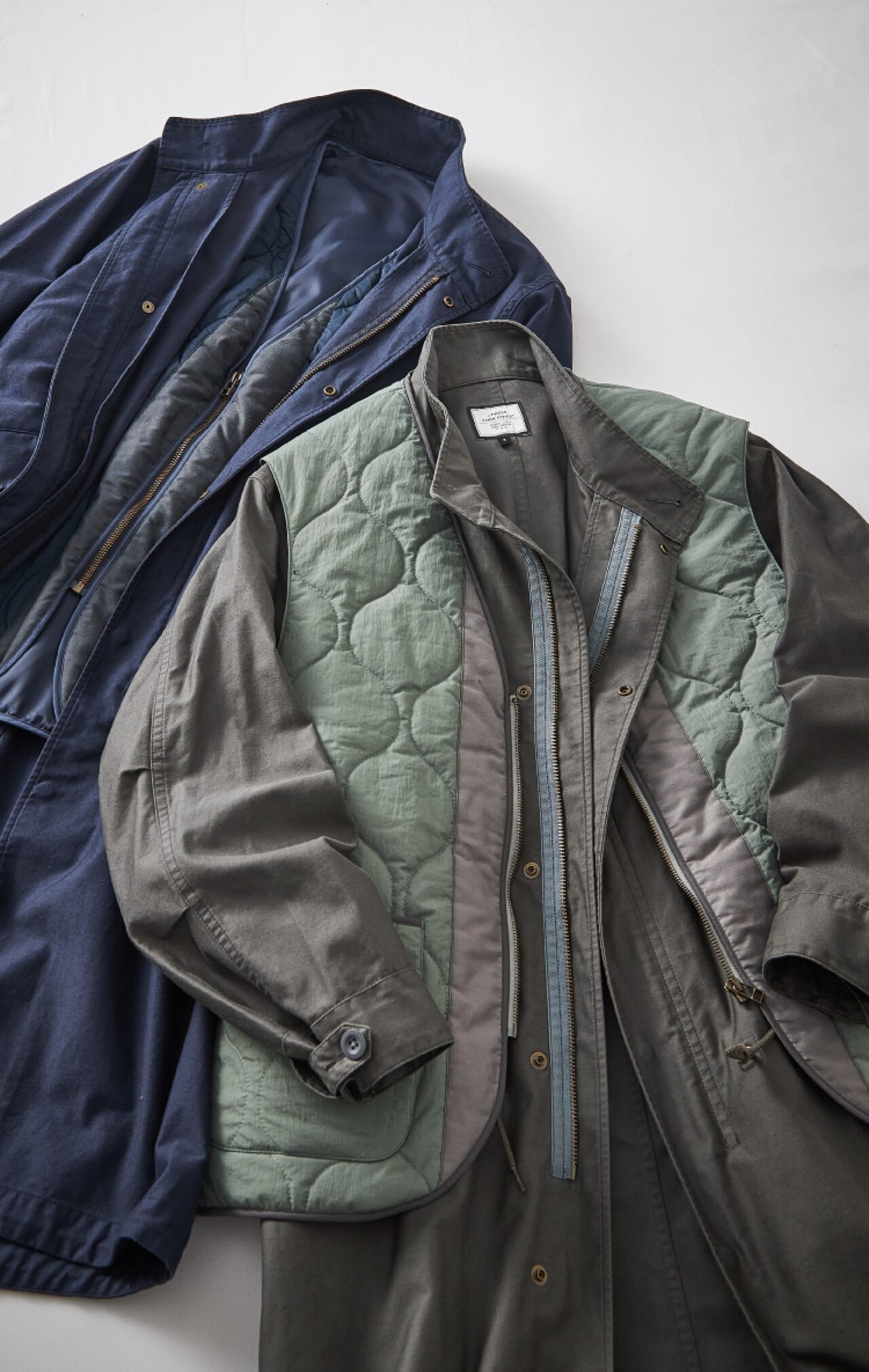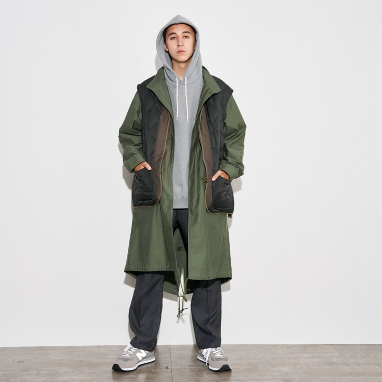 1960年代の英国において当時モッズ(モダニスト)と呼ばれたストリートな若者がこぞって羽織ったことから、モッズコート呼ばれたミリタリーコート。裾の後ろ側の長いフィッシュテールが特徴的で、ばさっと羽織れるオーバーサイズのコートはスタイリングの幅が広く、優れたデザイン性と機能性を兼備した逸品です。通称モッズコートですが、M65とM51の2つの型が存在します。今回はフードの無いすっきりとしたM65タイプをベースとし、現代版に落とし込んでいます。全体のゆったりとしたオーバーシルエットはそのまま、着丈や袖巾のバランスは今っぽく調整をしました。また、ライナーにキルティングのベストを搭載していますが、防寒としてライナーをライナーとして内側に着るのはもちろんですが、ライナーを外側にスタイリングできるようにサイジングを調整しています。気分に合わせて中でも外でも着用し、演出頂けます。