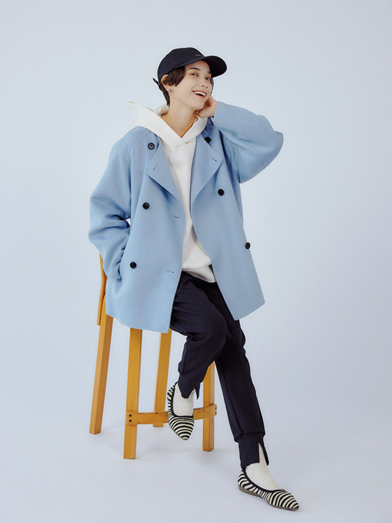 程よく立ちあがるフードで小顔見えし、顔回りはパッと華やぎます。