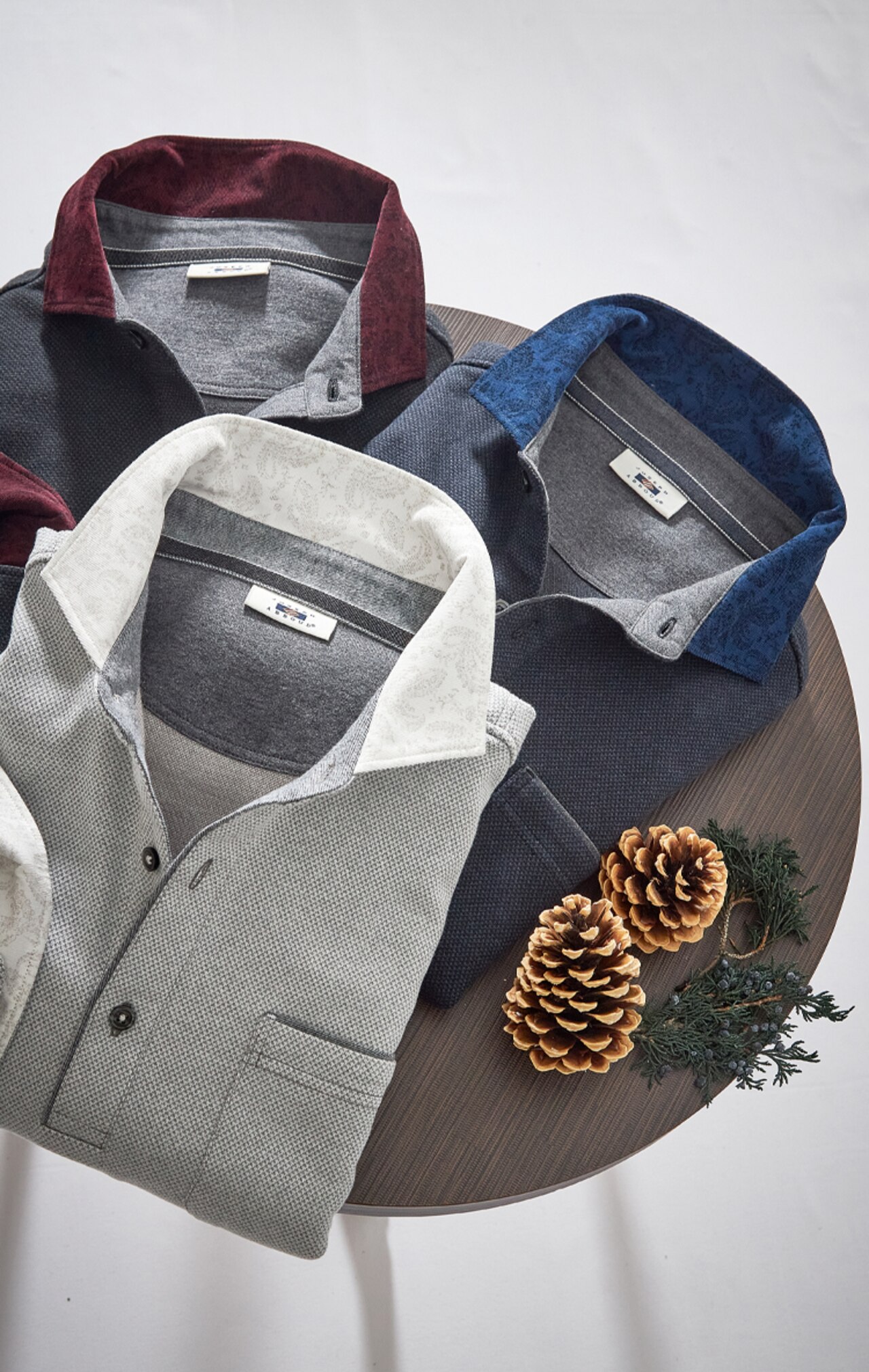 衿にはコーデュロイのシャツ生地のペーズリー柄プリントをコンビネーションしています。