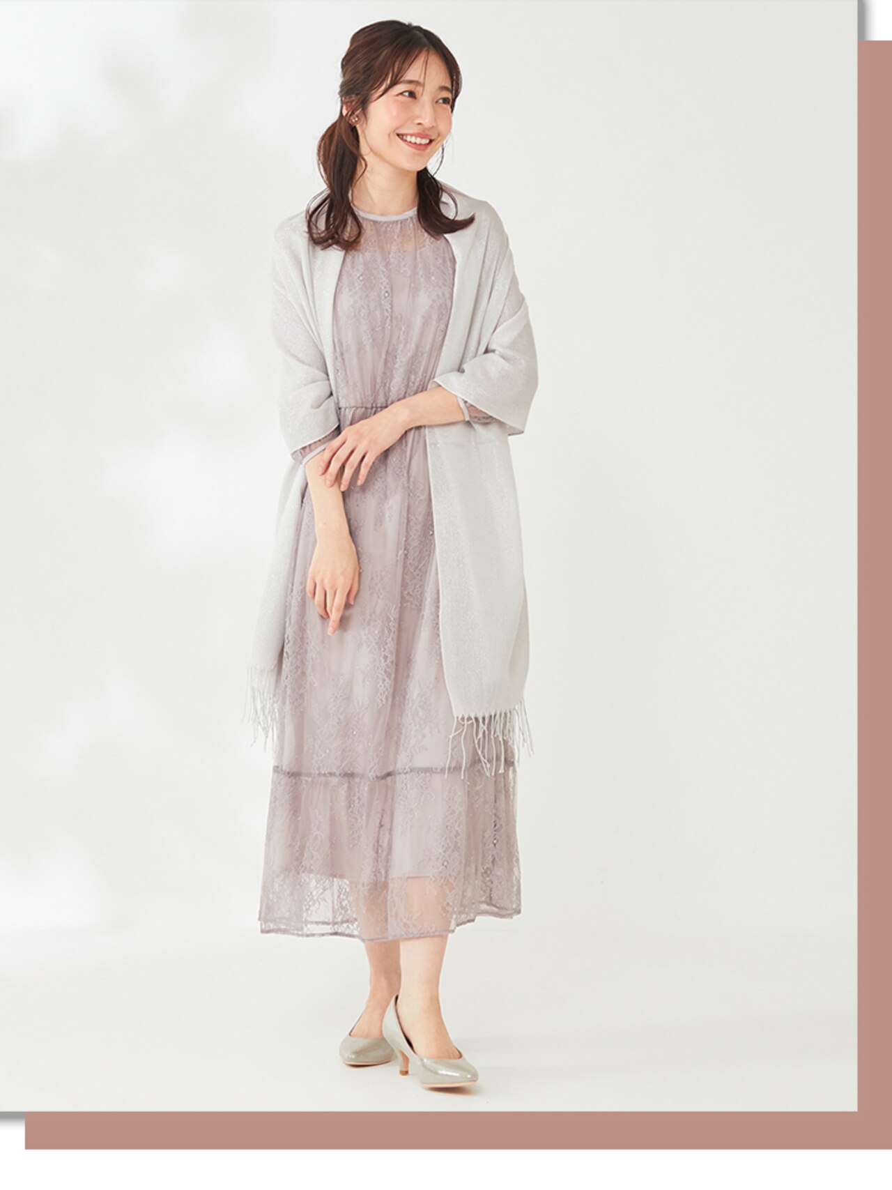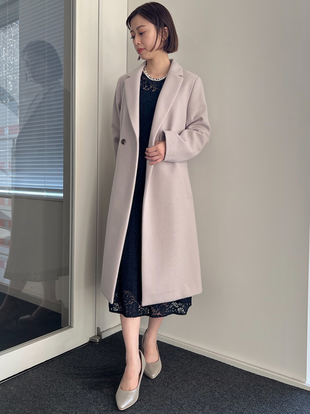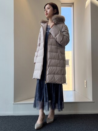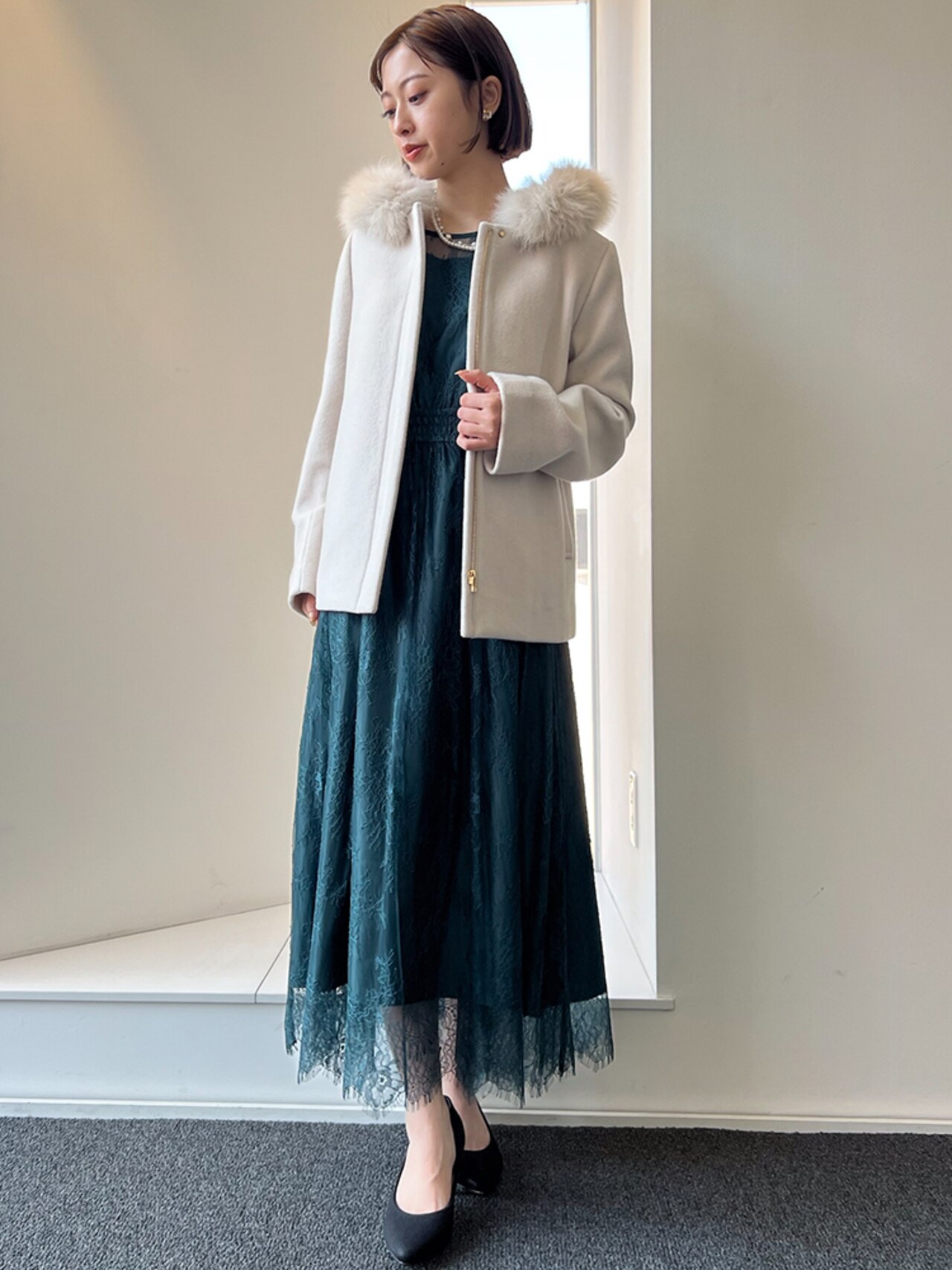 高級感のあるフォックスファー付きのコートはカジュアルスタイルだけでなく、ドレスとも相性抜群!