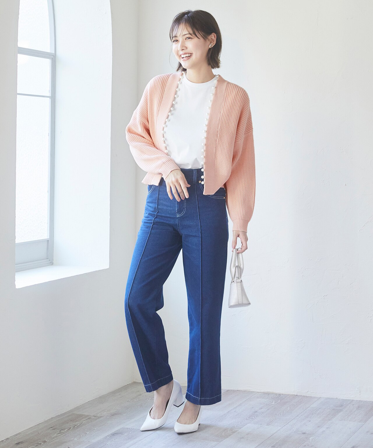 昨年から引き続き人気が続くパールカーディガン。