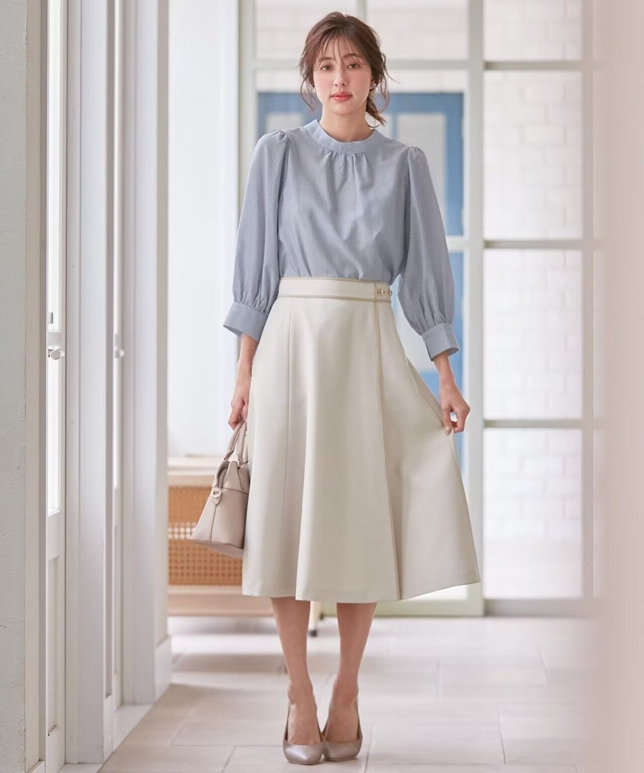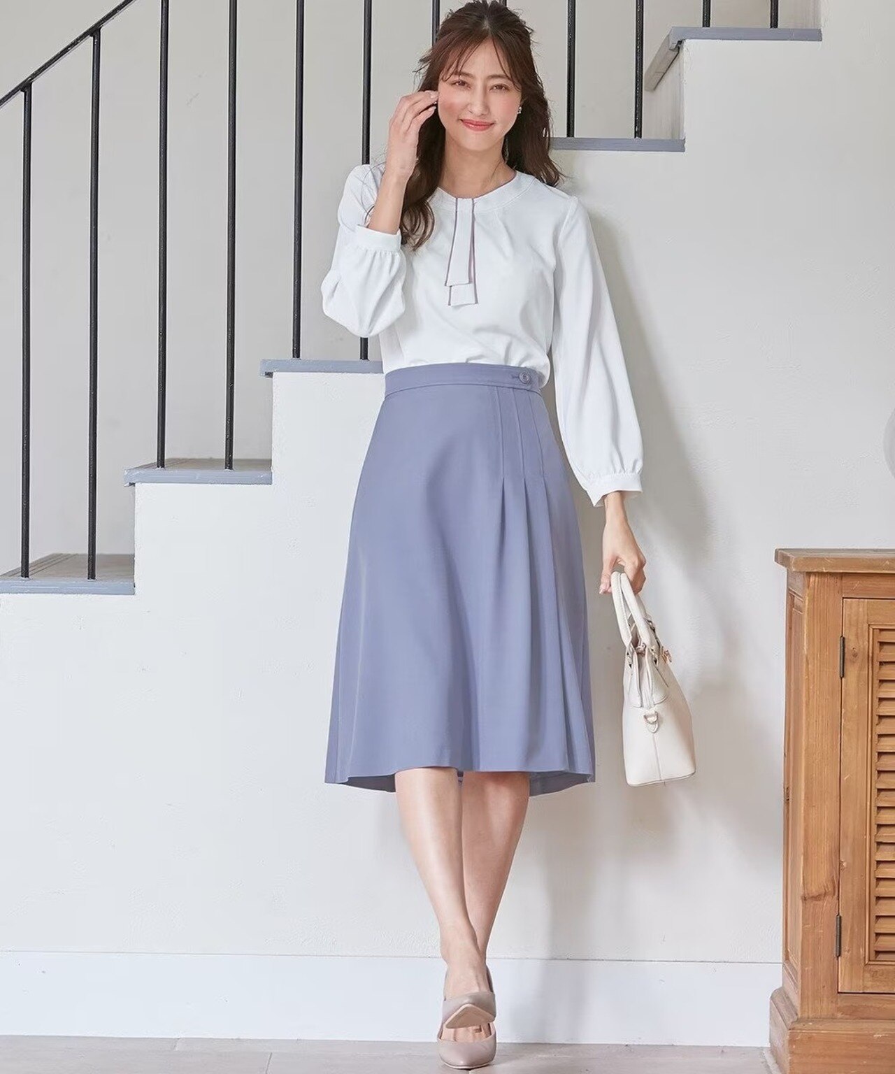 きれいめブラウス×フレアスカートで万人受けする正統派美人に。話しかけやすい優しげな雰囲気で好印象を装って。控えめデザインのブラウスにきれいなAラインシルエットのスカートがおすすめです。