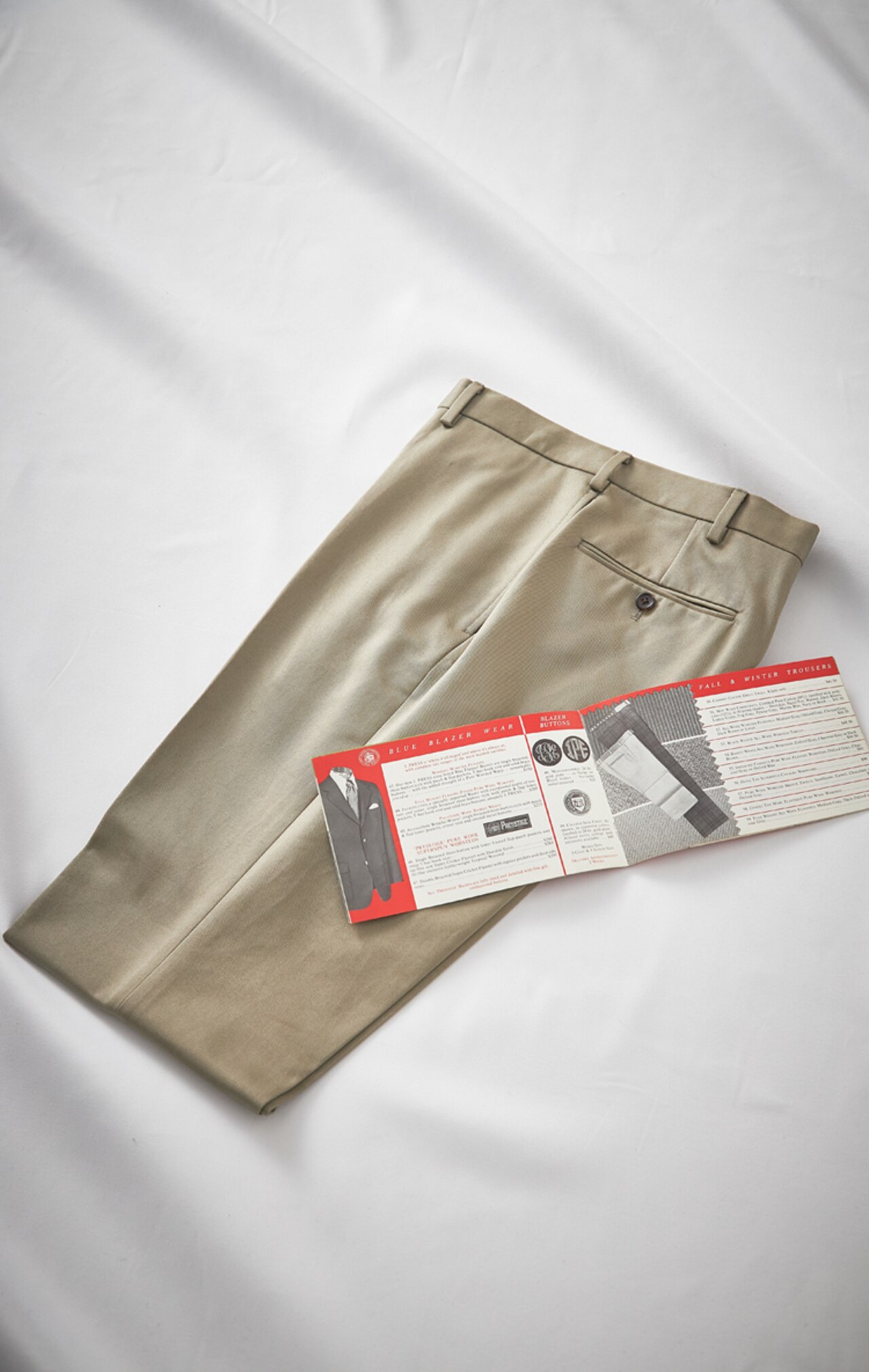 ネイビーブレザーにボタンダウンシャツ、レジメンタルネクタイ、そしてこのチノパンツ。このアメリカントラディショナルの王道的スタイルは、どのようのに生まれたのかご存じでしょうか。第二次世界大戦が終結すると、戦地から多くの復員兵が母国アメリカに引き上げてきます。そのなかには大学で学び直したいという若者もおり、彼らを率先して受け入れたのがイエール大学。そう、彼らが軍隊時代のチノパンツをキャンパスでも愛用し、ブレザーと合わせていたのが、冒頭のスタイルの発祥と言われているのです。ブレザーを着てイエールに復学する兵士の中には、陸軍士官学校(ウエストポイント)出身のエリートもいたでしょう。J.PRESSにラインナップしたチノパンツは、彼らが士官学校で着ていた制服がベースとなっています。まずは極細のスーピマコットン製コーマ双糸を高密度に練り上げ、美しい光沢とハリがありつつ、タフな耐久性も備えた、日本では”ウエポン”と略称される極上のコットンチノクロスを再現しました。これをJ.PRESS伝統のパイプドステムシルエットに乗せ、洗いはかけずにセンタークリースを入れたパンツは、ジャケットと上品に合わせられる”ドレスチノ”と呼ぶにふさわしい仕上がりです。さらに、履き込むほど風合いが増し、身体になじんでゆく楽しみがあり、年月を経るほど手放せない一本となるはず。ブレザーとの普遍的なコンビネーションはもちろん、多彩に着まわせる新定番パンツです。
