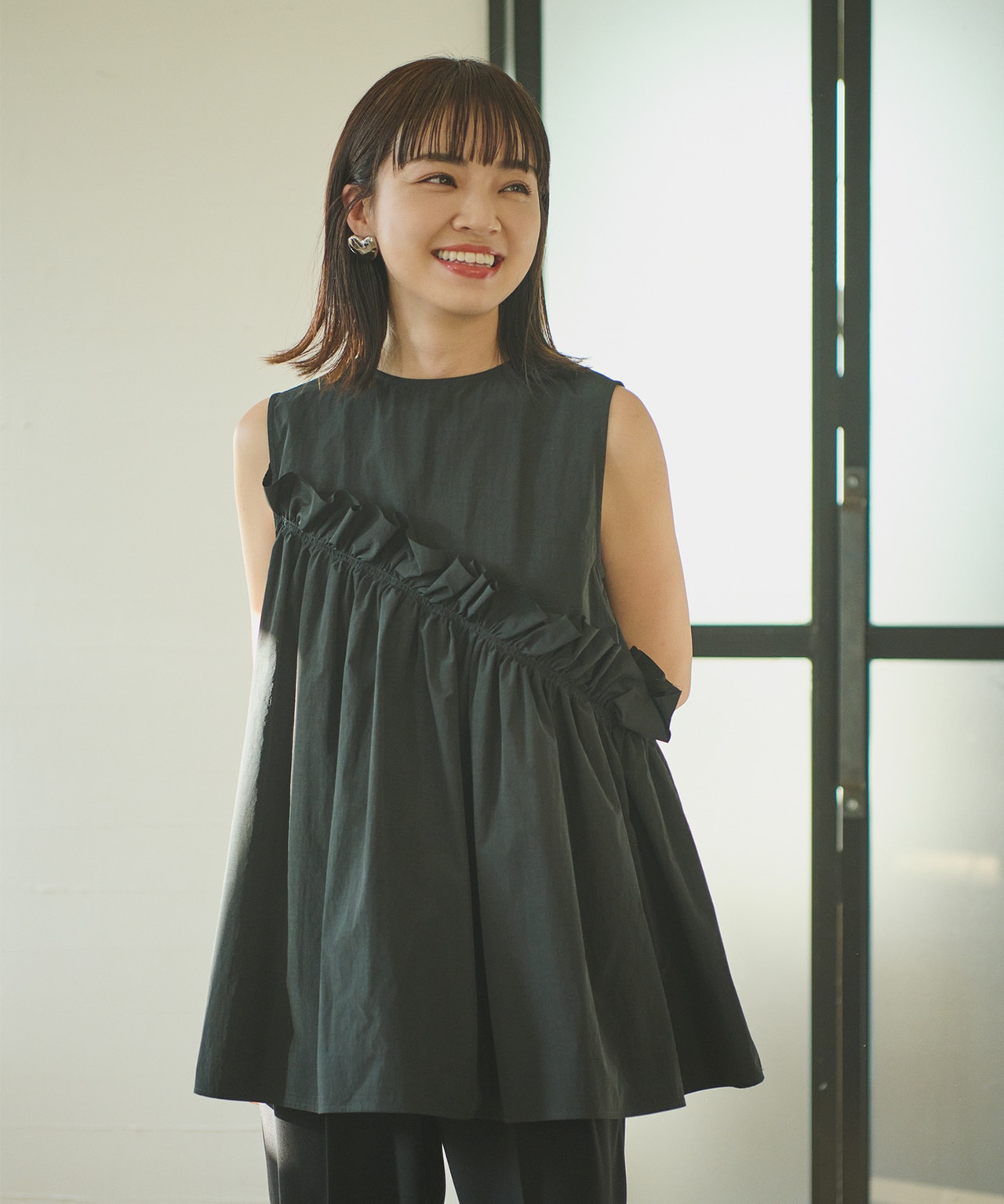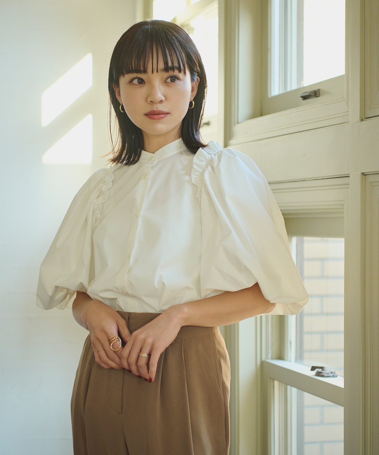 内側に入ったギャザーが肩周りも華奢見せしてくれます。とろみ素材のパンツやハイウエストのワイドパンツと合わせてスッキリと合わせるのがおすすめ。 -