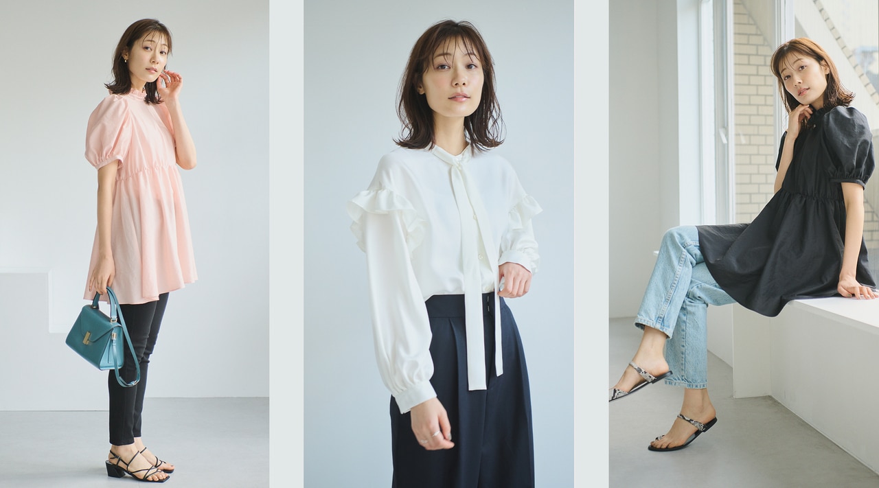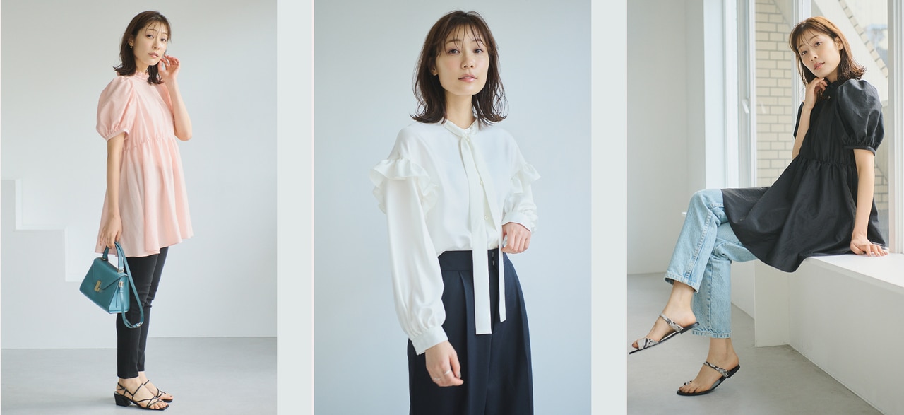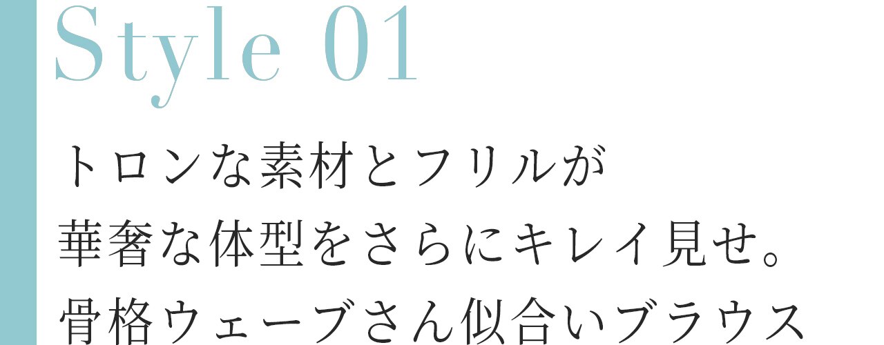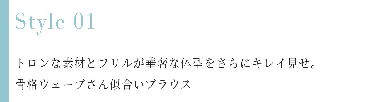 とろみ素材で華奢なデコルテを感じさせることで着やせ効果抜群。首が細く長いため首周りにディティールがあるアイテムがとても良く似合うので、リボンディティールも大得意です。