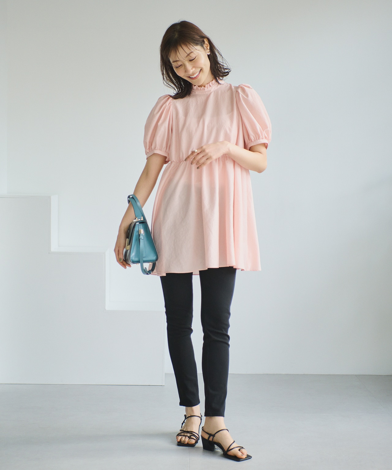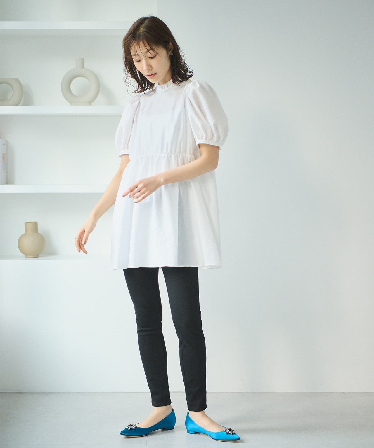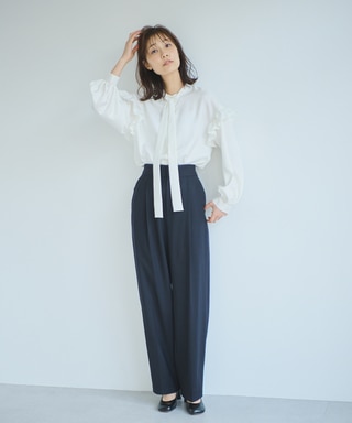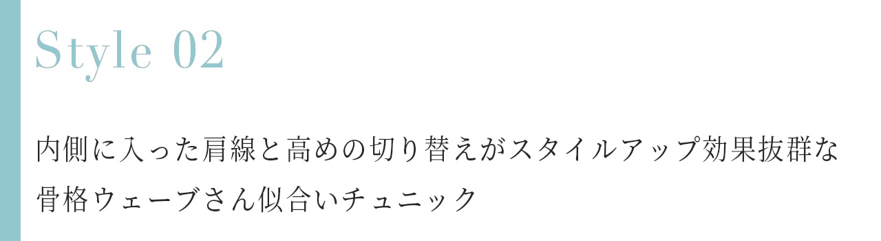 ややハイウエストでの切り替えが入っているチュニックでスタイルアップするのが◎骨格ウェーブさんは首が細く長いため、首周りにディティールがあるアイテムがとても良く似合います。ハイネックのフリルで長く細い首を素敵に彩ってください。
