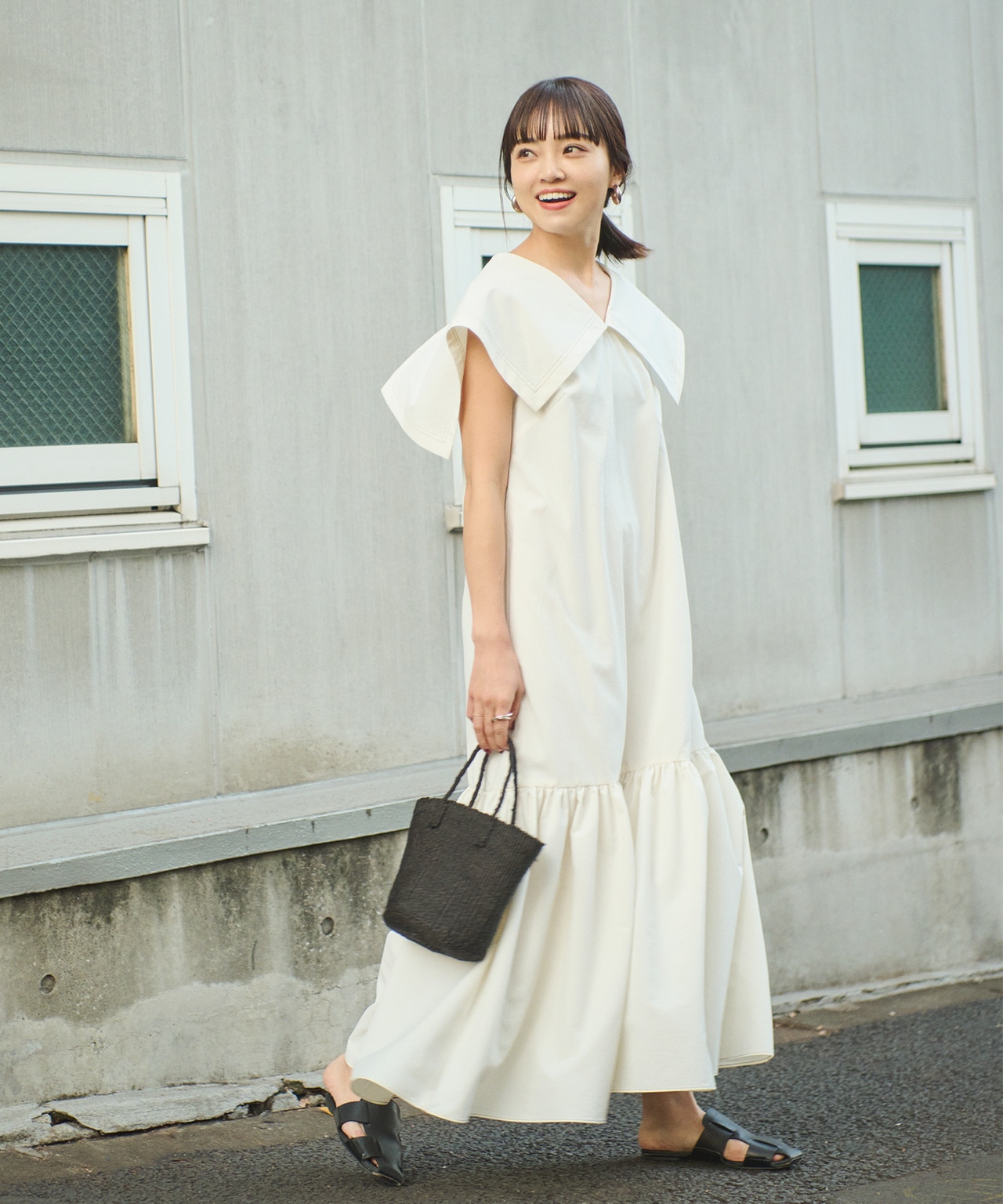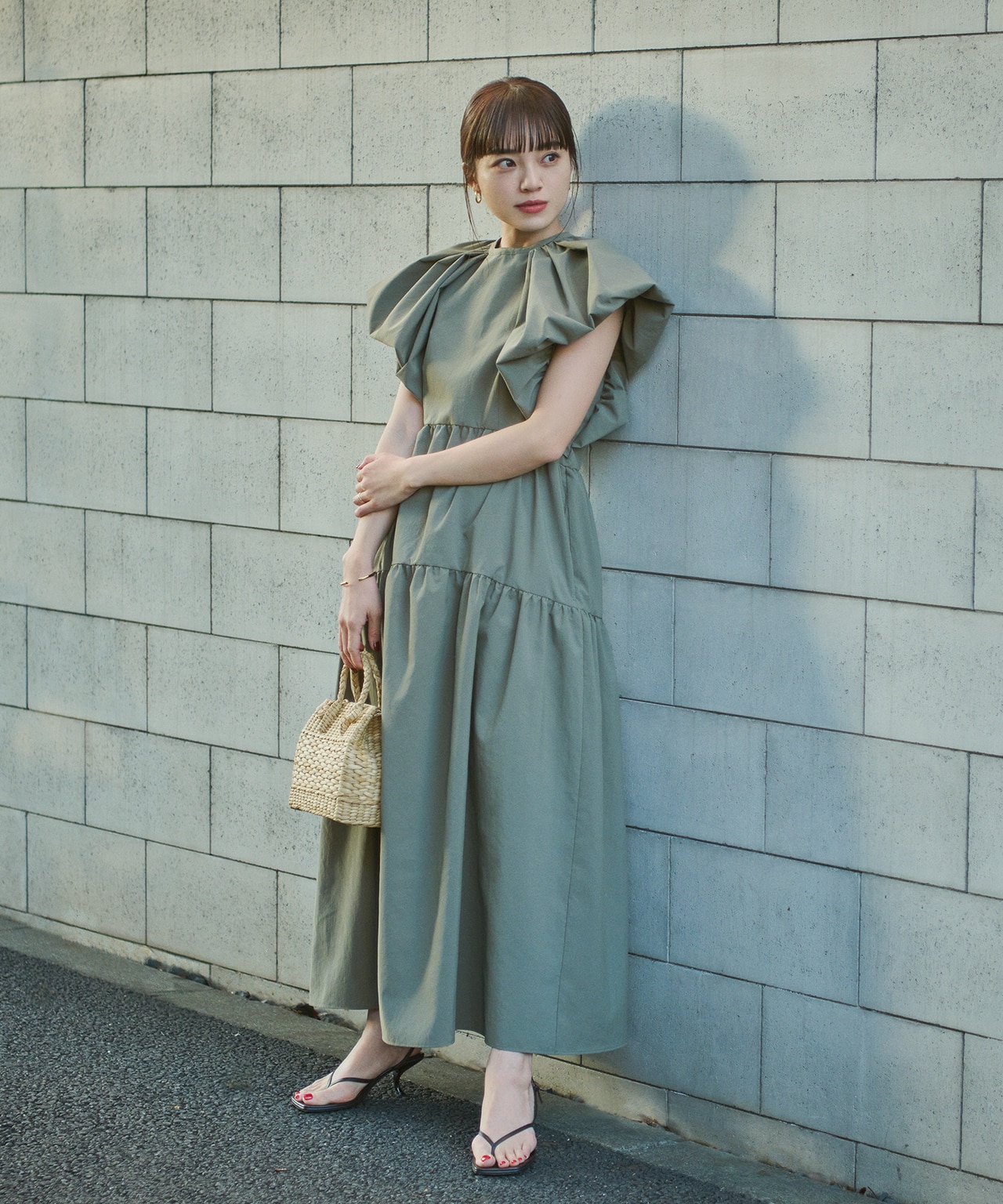 ティアードスカート部分も高い位置で切り替わるデザインが脚長効果を発揮します。足元は軽やかに見せてくれる華奢な靴を選んで。 -