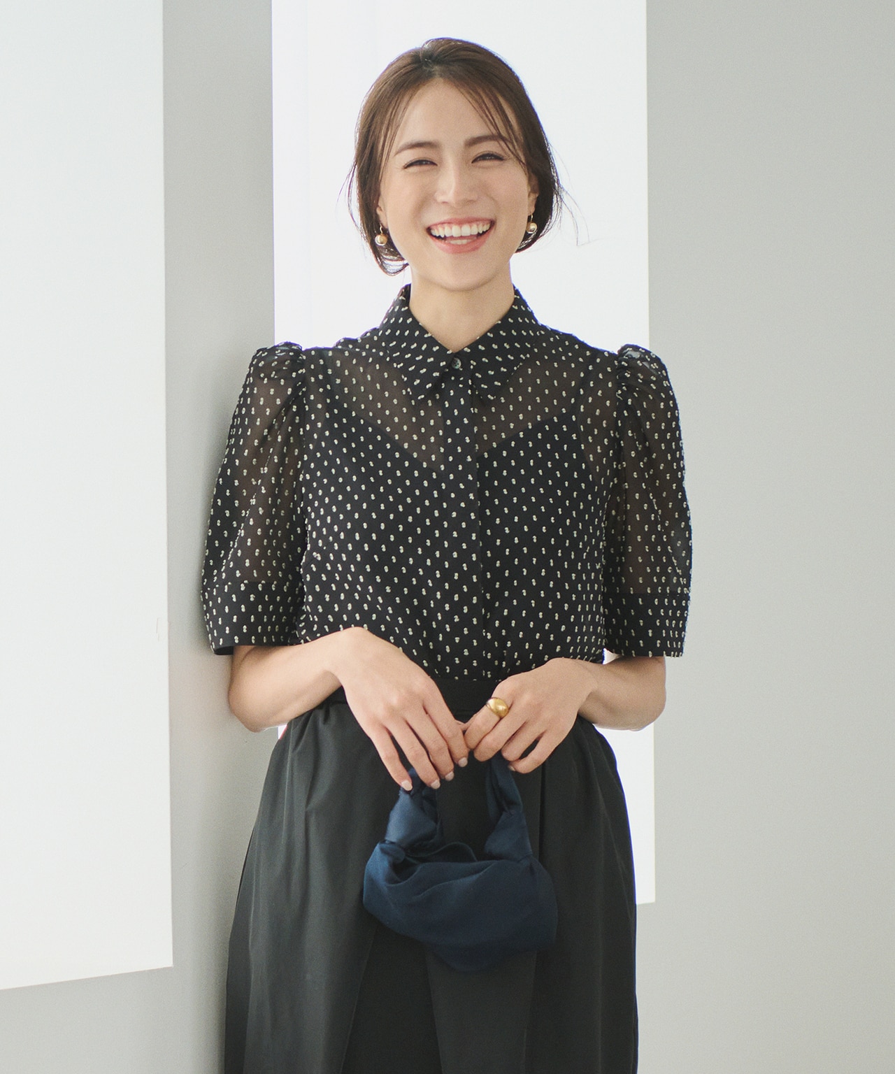 二の腕を細く見せる短い袖とハイネックデザインでシャープな印象でも目線が上がってスタイルアップが叶います。ハイウエストのワイドパンツやフレアスカートでフィット&フレアのラインを意識して。