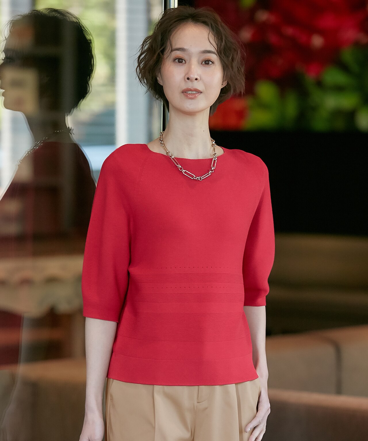 美シルエットで女性らしいフォルムが特徴のニット。適度にボリュームのある袖デザインと、裾部分の編地変化で表現したさりげないボーダー柄がポイント。
