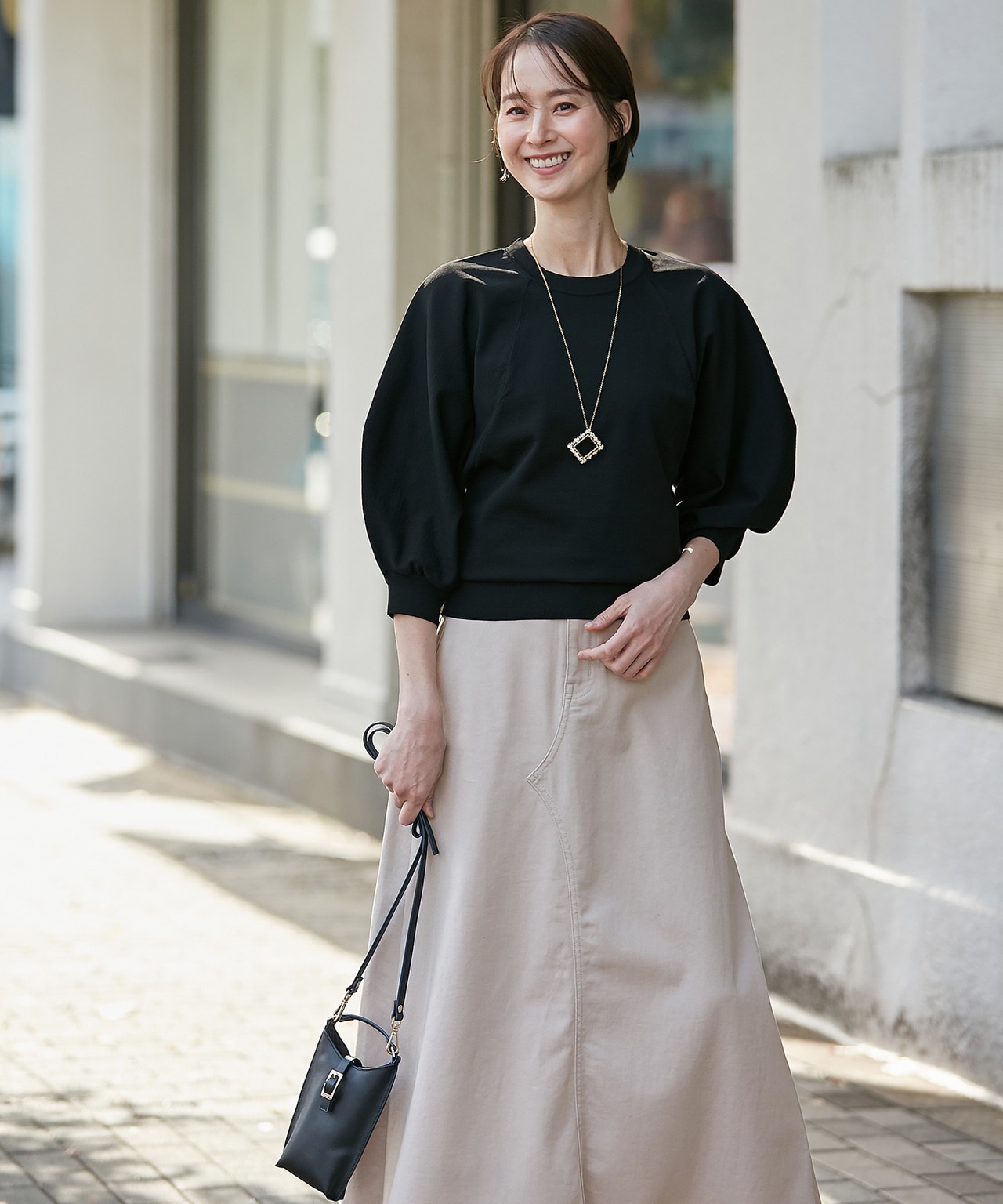 ふんわりとしたボリューム袖がフェミニンなニット。軽く、ソフトな着心地と、コンパクトで立体的なシルエットに注目。
