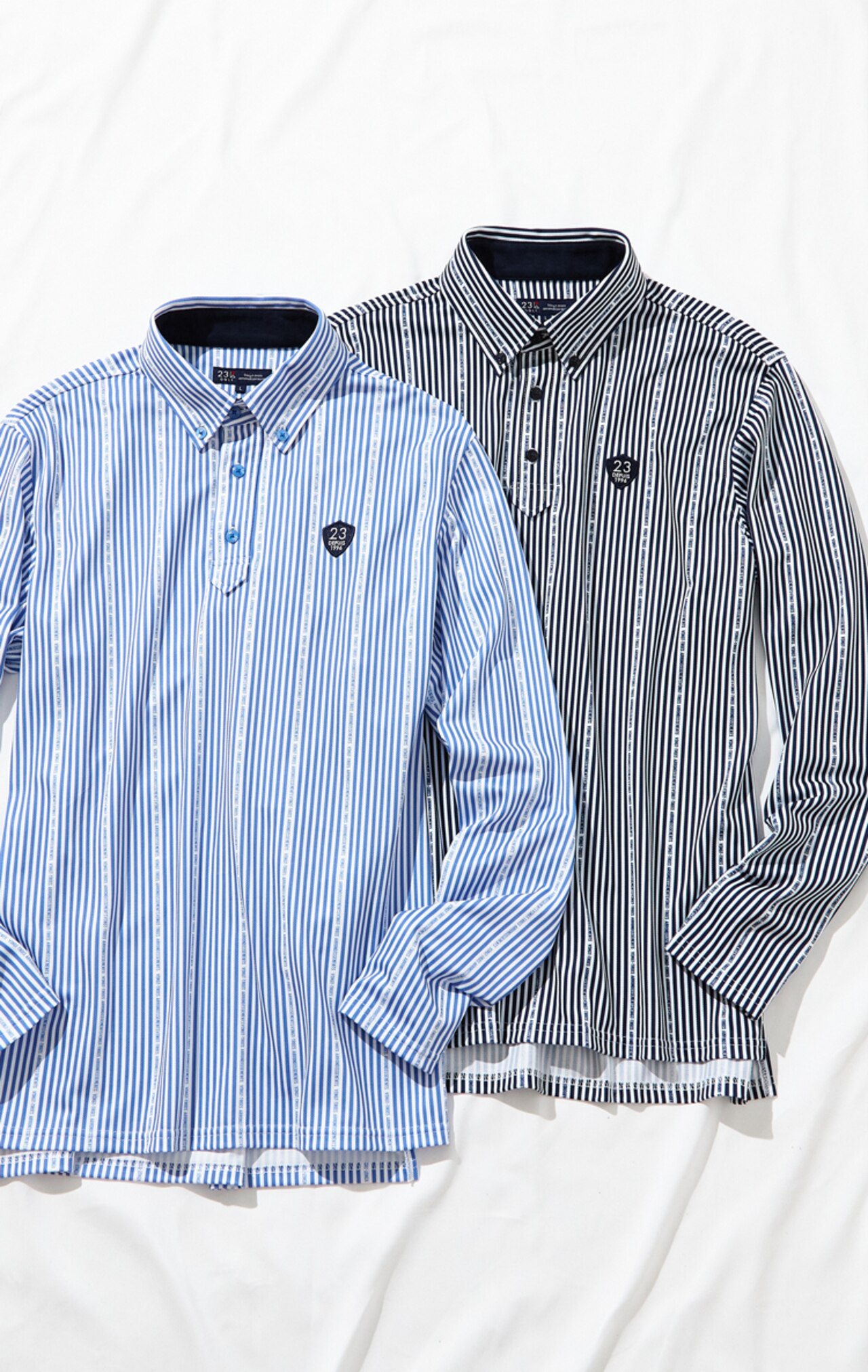 紳士的で凛々しいストライプ柄は、永続的に愛される定番柄。そんなストライプ柄にブランドロゴを加え、23区GOLFらしく価値観ある一枚に仕上げた今シーズンのストライプシャツ。