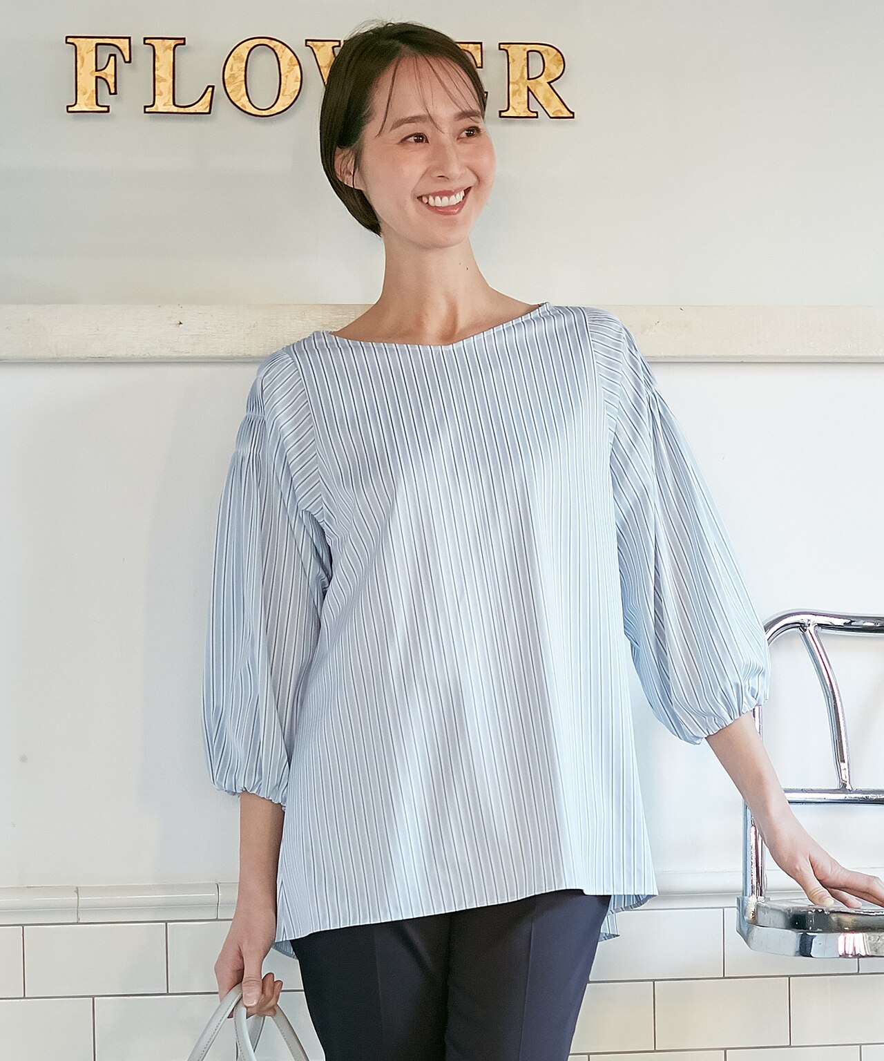 爽やかなアクアストライプが春の気分を高めてくれる1枚。ジャージー素材ならではのストレッチ性や肌離れの良さが魅力。肩のタックディテールとネックラインが女性らしい印象です。