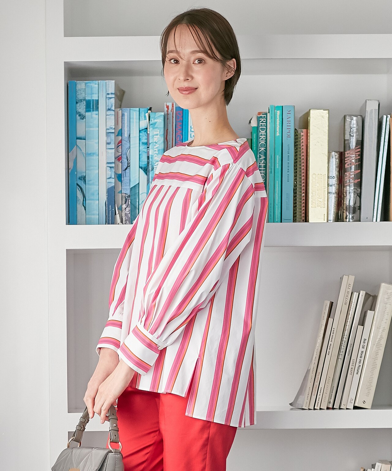 大胆なストライプ柄を活かしたプルオーバーブラウス。程よい光沢感とさらりとした風合いで、適度にゆとりのあるシルエットと前後差のある着丈がヒップ周りをカバーしてくれるので、パンツスタイルにおすすめです。