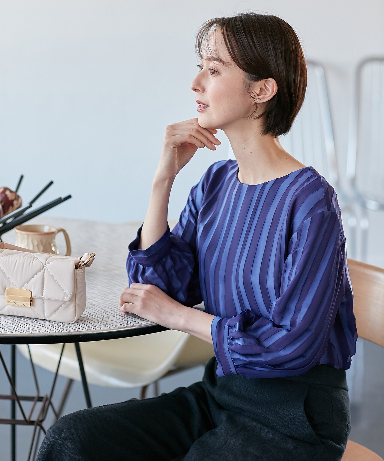 ランダムストライプ柄が映えるブラウス。1枚ではもちろん、コートやジャケットインでも華やかさのあるデザインです。春らしい軽やかさと、オパール素材の陰影でリッチ感を感じられます。