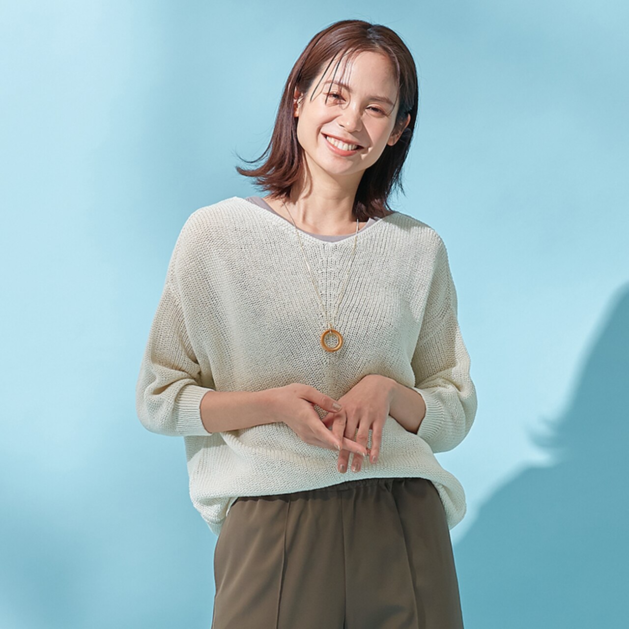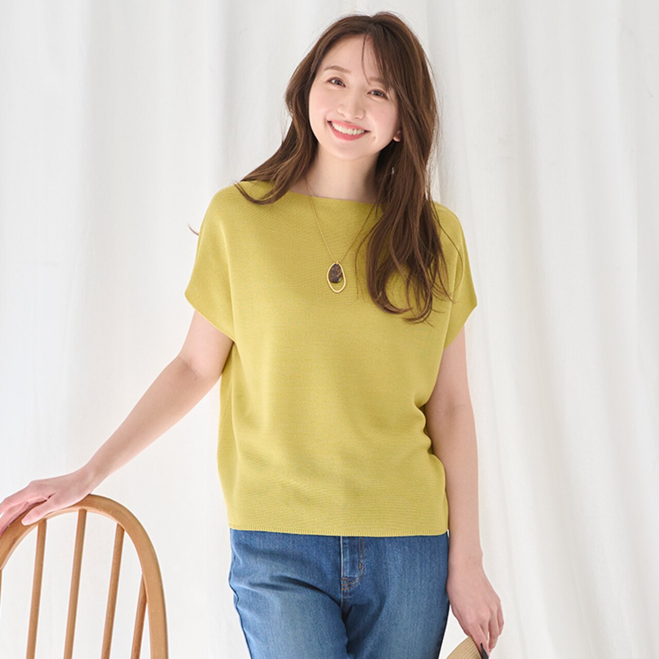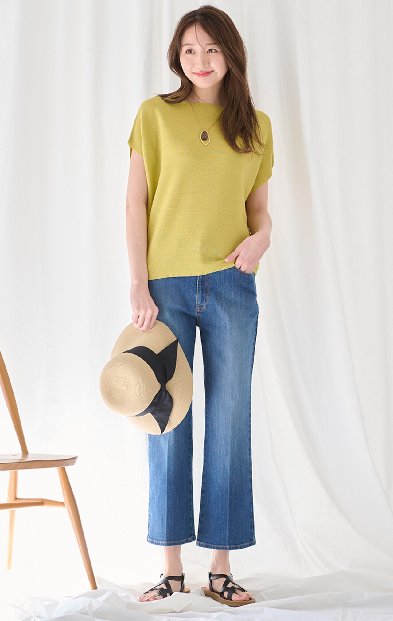夏に嬉しいUVケア機能がついたコクーンニット。洗濯機洗い可能&アンチピリングで扱いやすさも抜群!パッと華やかな印象のイエローにトレンドのフレアデニムを合わせて一気に旬顔コーデに。