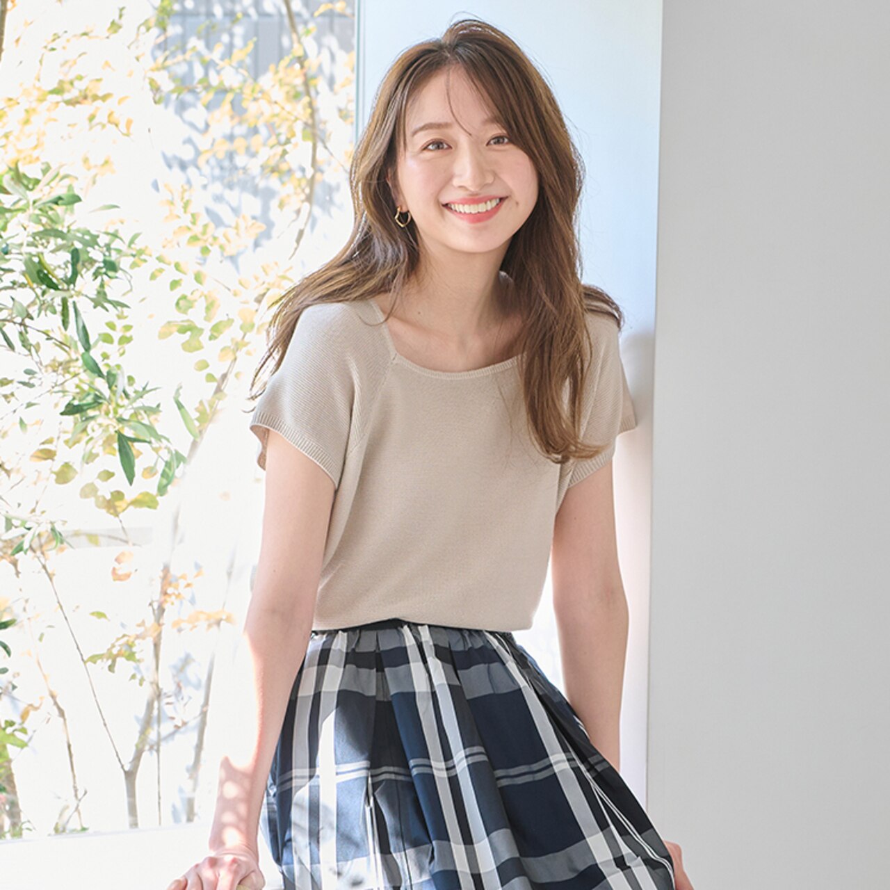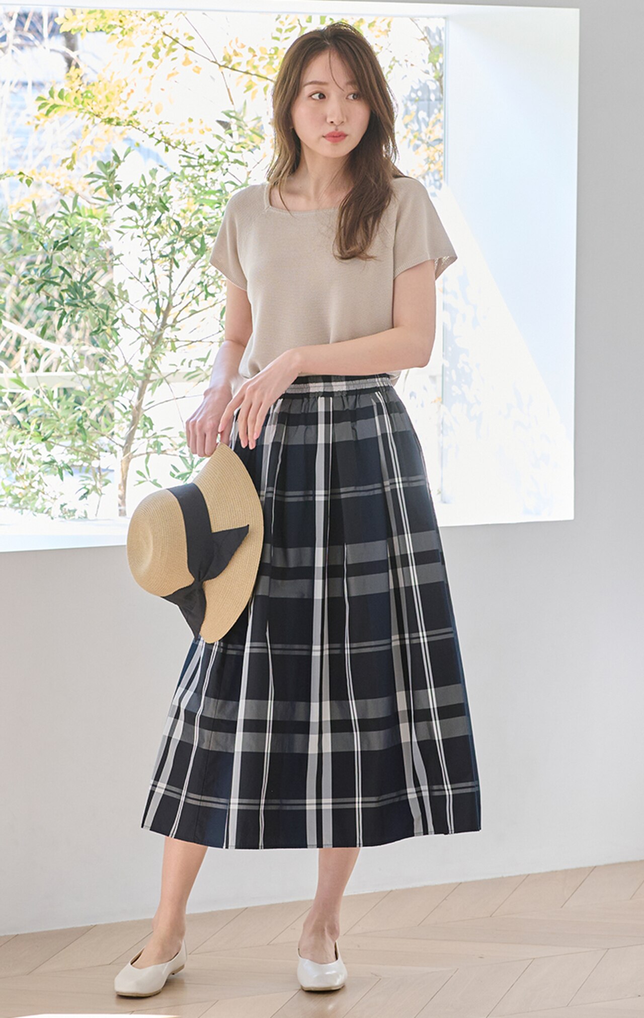 大ぶりのチェックスカートを合わせて大人レディなコーディネートに。