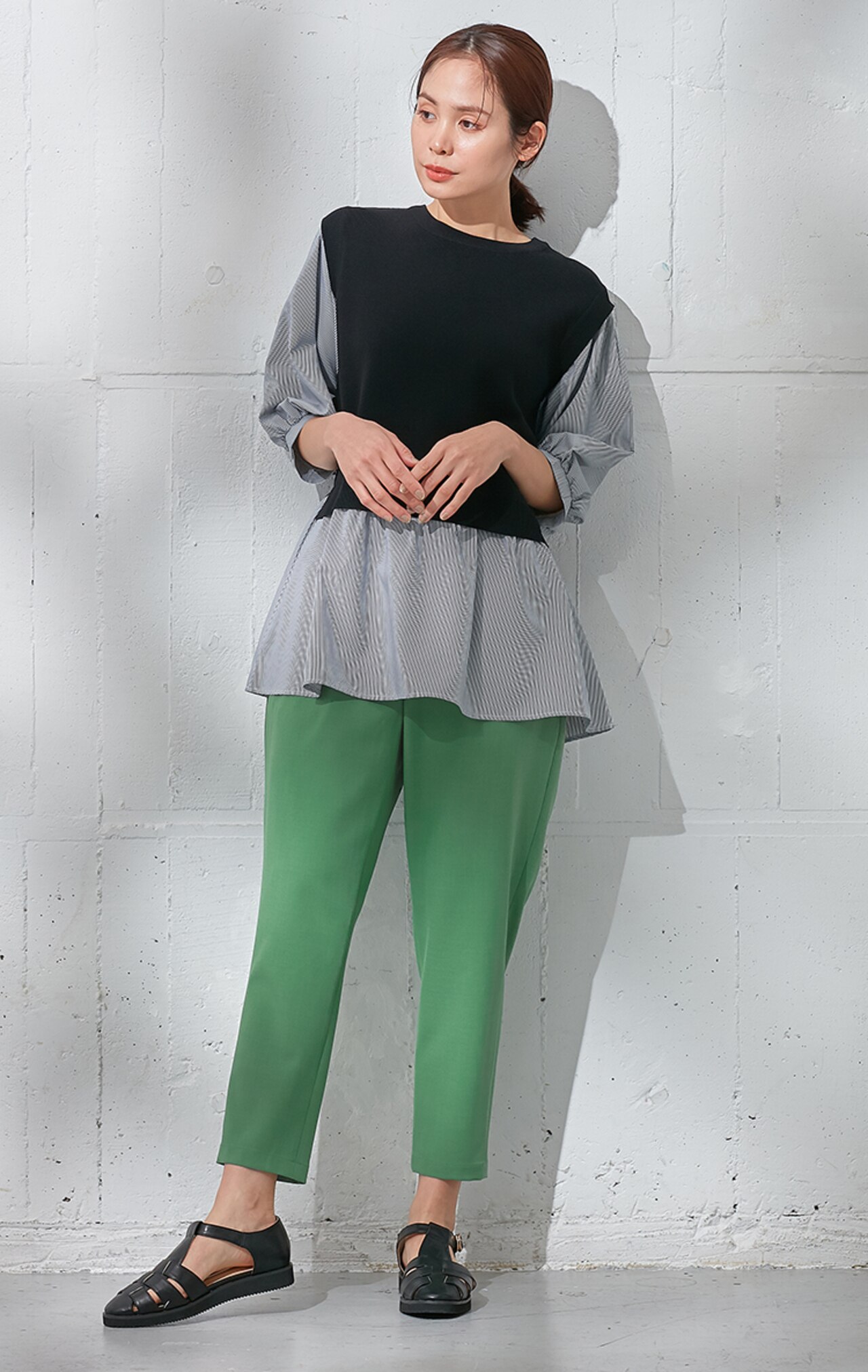 細身のパンツと合わせれば、バランス良く決まります。ボトムスには初夏にピッタリの映える緑パンツをセレクト。