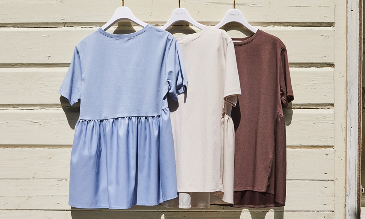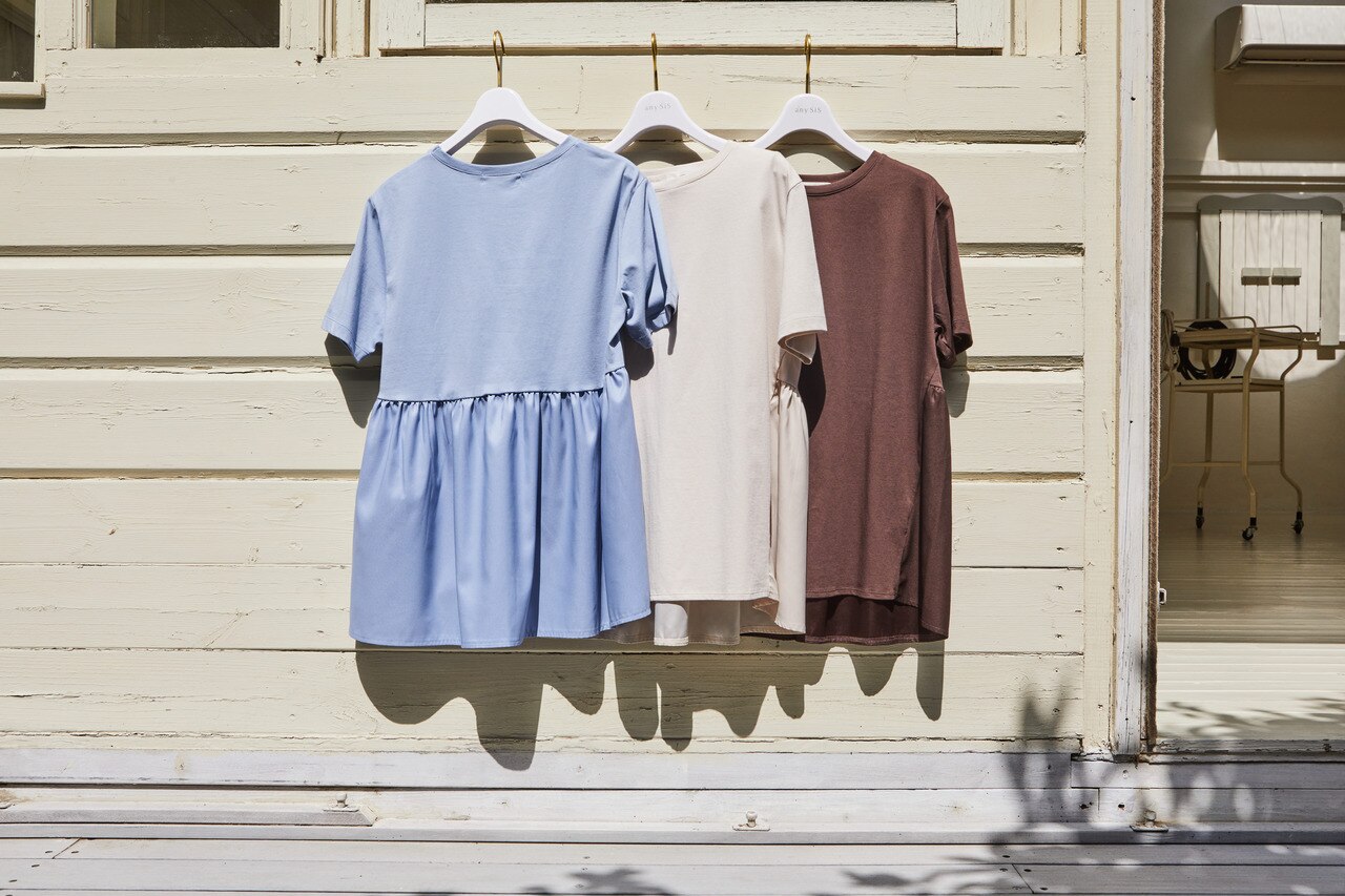 フロントはシンプルなTシャツのデザインで着回し力抜群。バックはウエストからサテン生地をドッキングしたデザインで、気になるお尻周りを可愛くカバーできます。薄手で清涼感があり、透け感が気にならない為、真夏まで快適に着用していただけます。