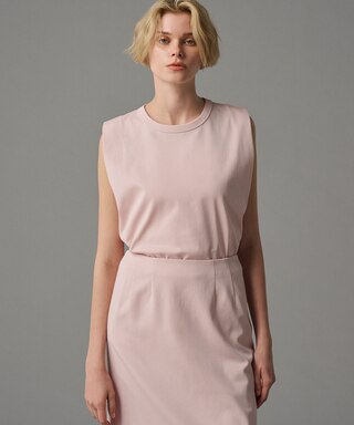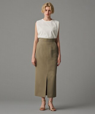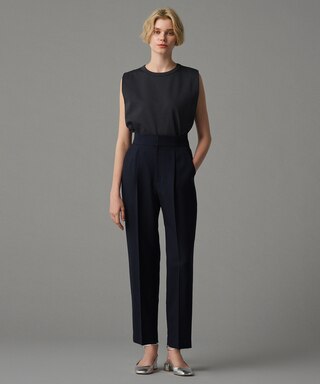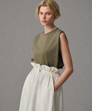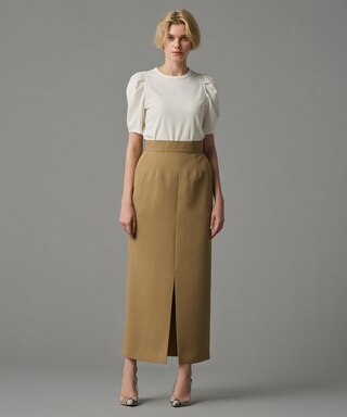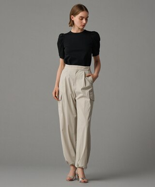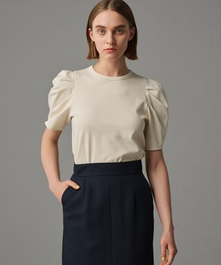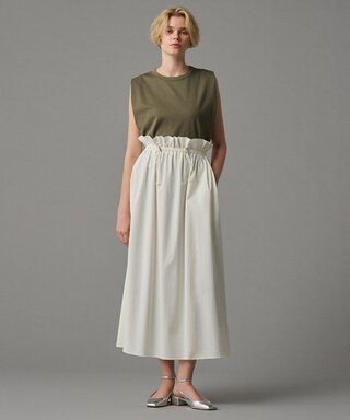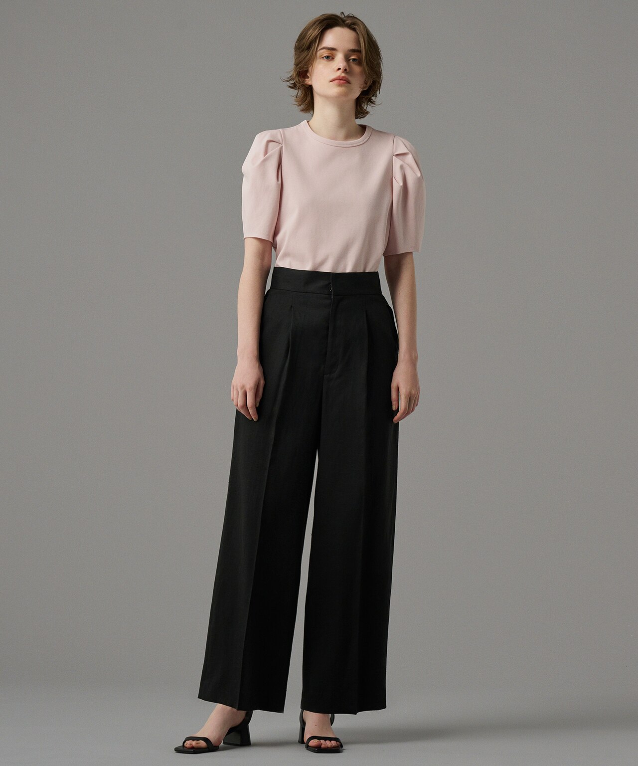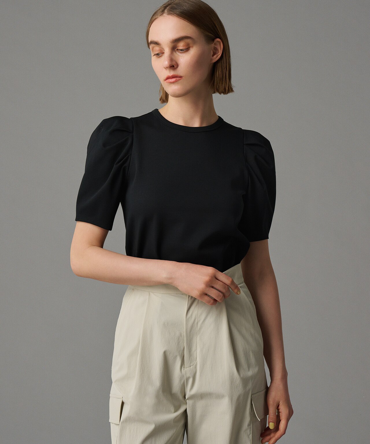 素材のハリを生かしたタックで誰が着てもサマになる分量感に仕上げています。ボディはコンパクトにまとめてメリハリを出すことで、甘くなりすぎずモダンな雰囲気に。