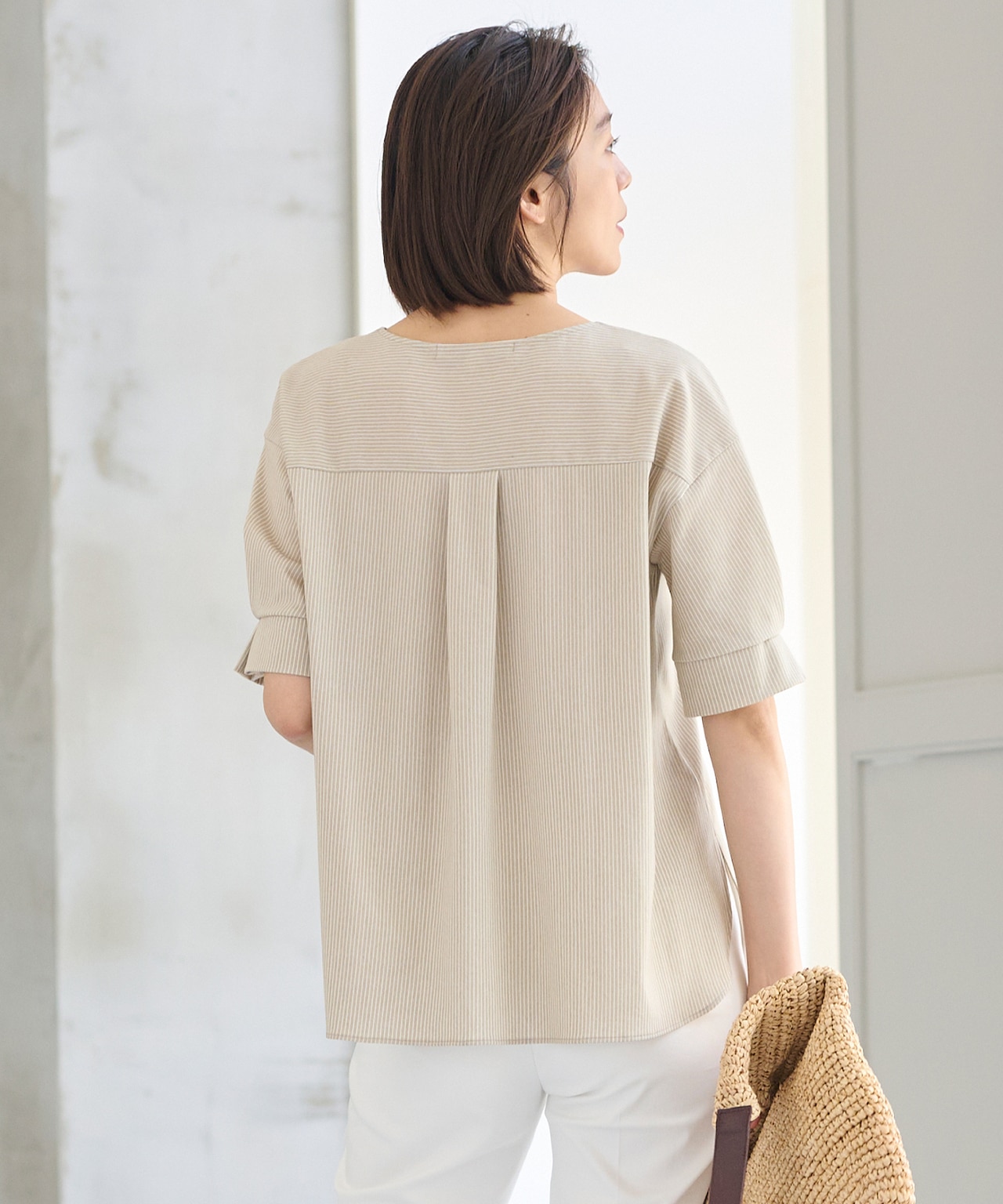 さり気ないストライプ柄が映える、さらっとした着心地のカットソー。女性らしいデザインスリーブと、すっきり見えを叶えるキーネックデザインがポイント。
