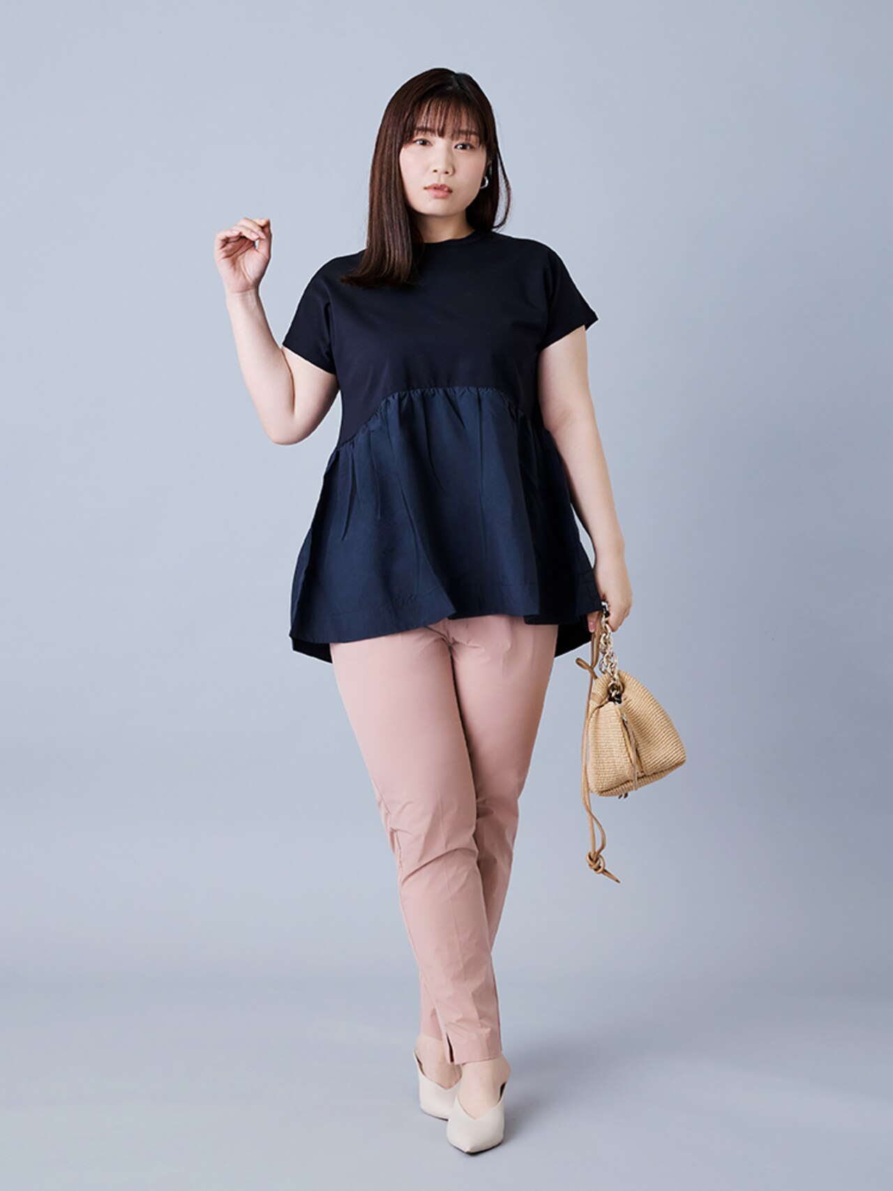 ストレッチ素材に、ウエストゴム仕様など、Lサイズモデルさんにも嬉しいポイントが盛りだくさんです!