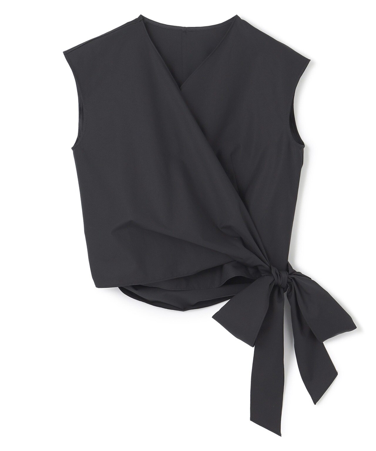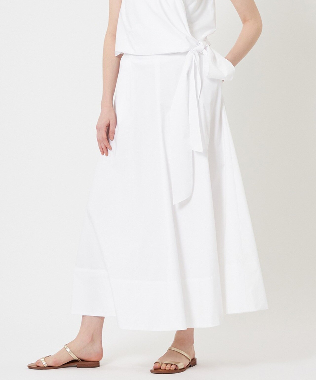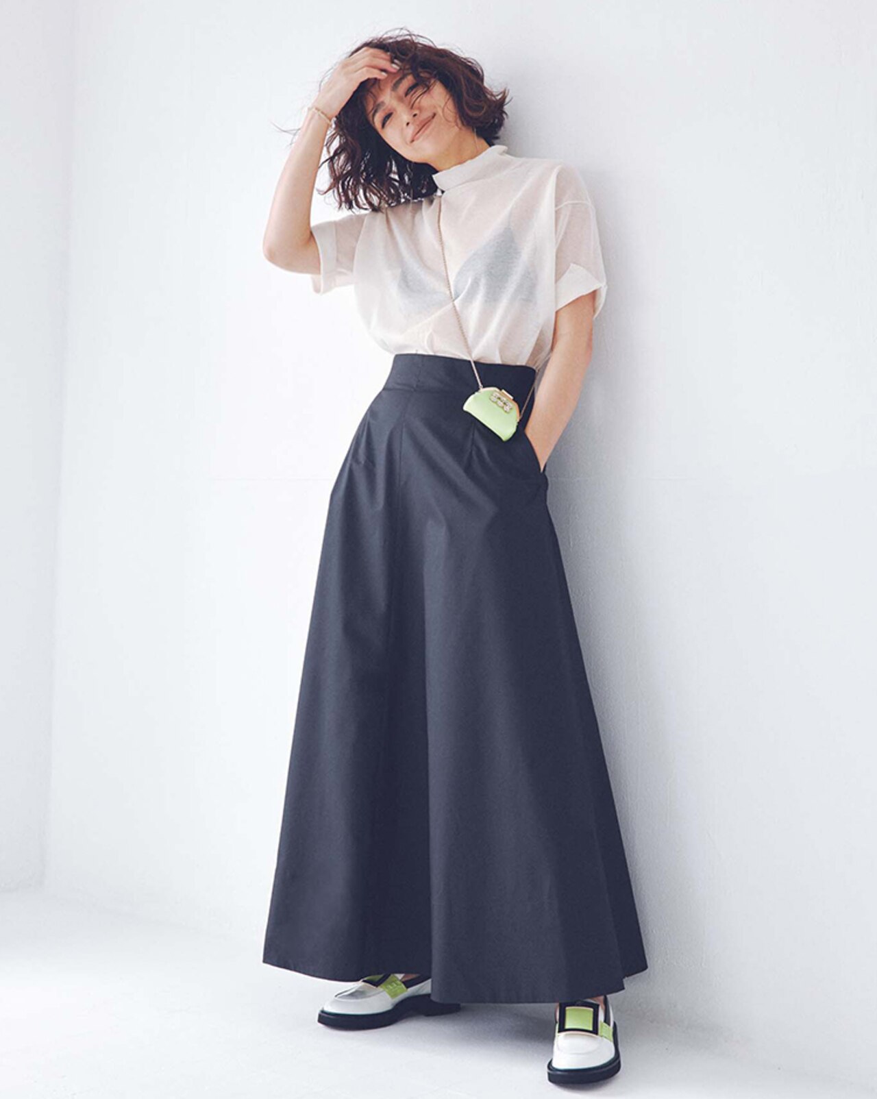 カシュクールトップはどんなボトムスにもマッチするように、丈をわずかに短めに設定。甘い印象になりやすいリボンは、使用するファブリックや結んだときのボリュームを計算し、もたつかずシックな印象に。同素材のロングスカートは、すっきりとしたシェイプとたおやかに広がる裾のコントラストがドラマティック。セットアップで着ればドレスライクにも着用できるので、旅先での急なフォーマルシーンにも対応可。