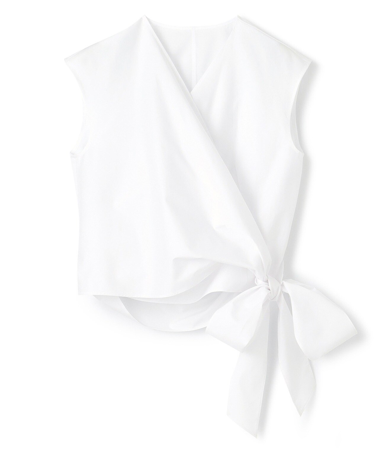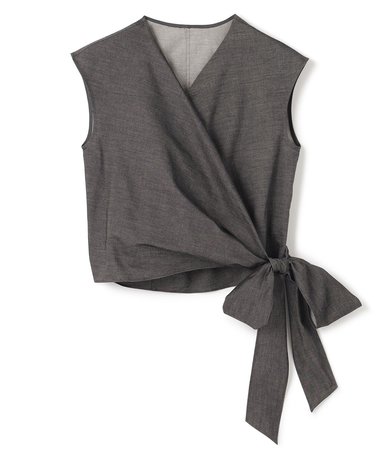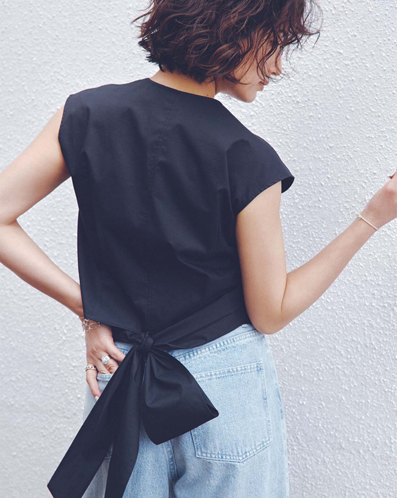 カシュクールトップはどんなボトムスにもマッチするように、丈をわずかに短めに設定。甘い印象になりやすいリボンは、使用するファブリックや結んだときのボリュームを計算し、もたつかずシックな印象に。同素材のロングスカートは、すっきりとしたシェイプとたおやかに広がる裾のコントラストがドラマティック。セットアップで着ればドレスライクにも着用できるので、旅先での急なフォーマルシーンにも対応可。