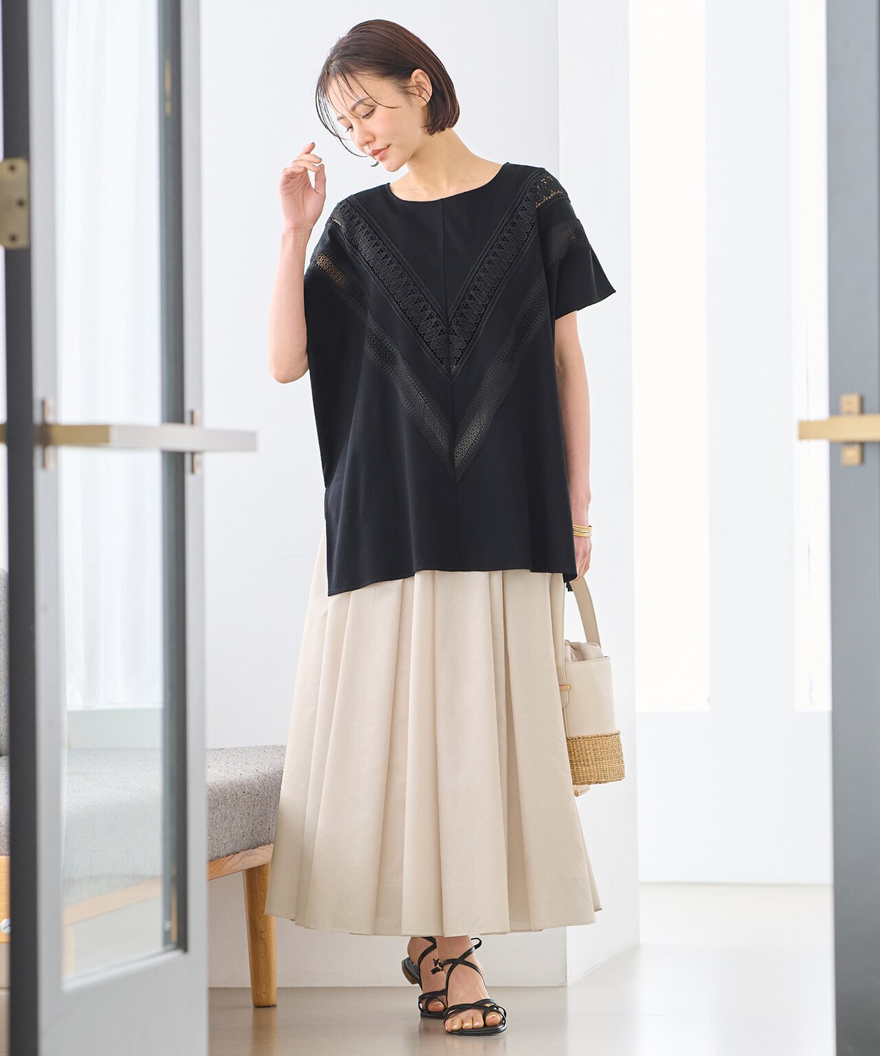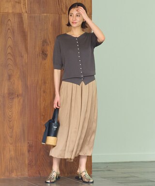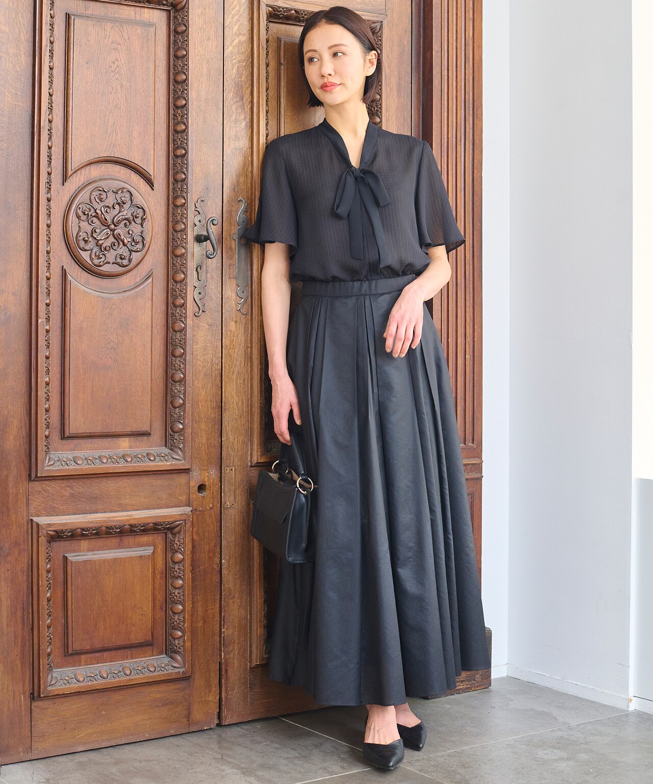 裾に向かってたっぷりとボリュームを感じるボックスタックが華やかなフレアスカート。程よい光沢があり、トレンドのシアー素材で今年らしいスタイリングが完成。
