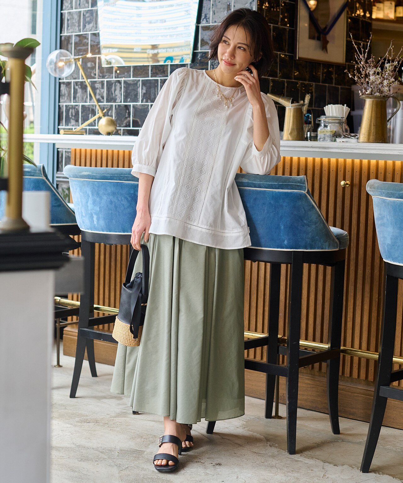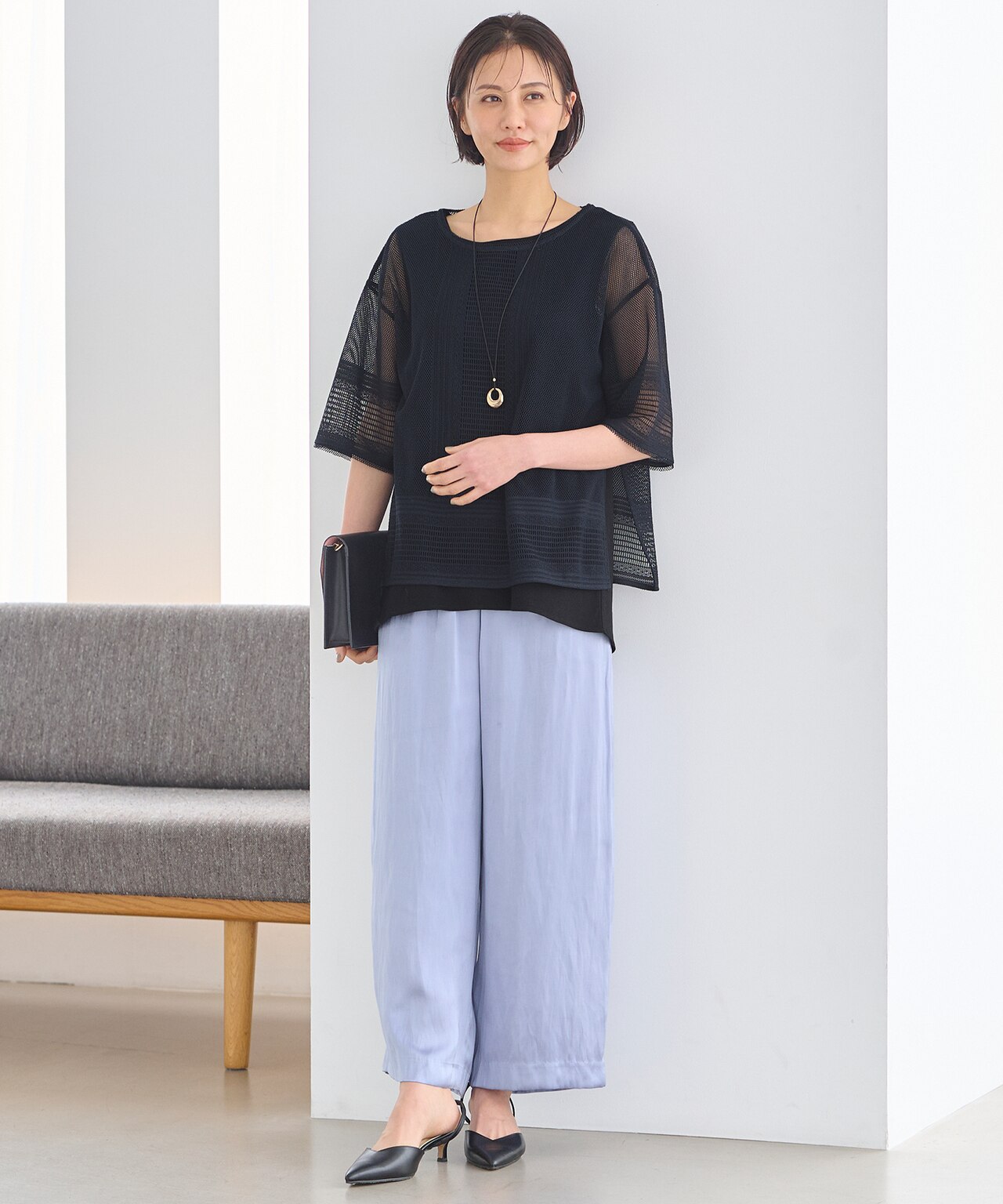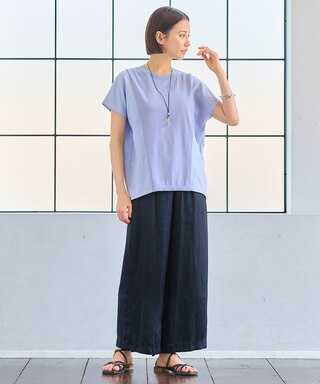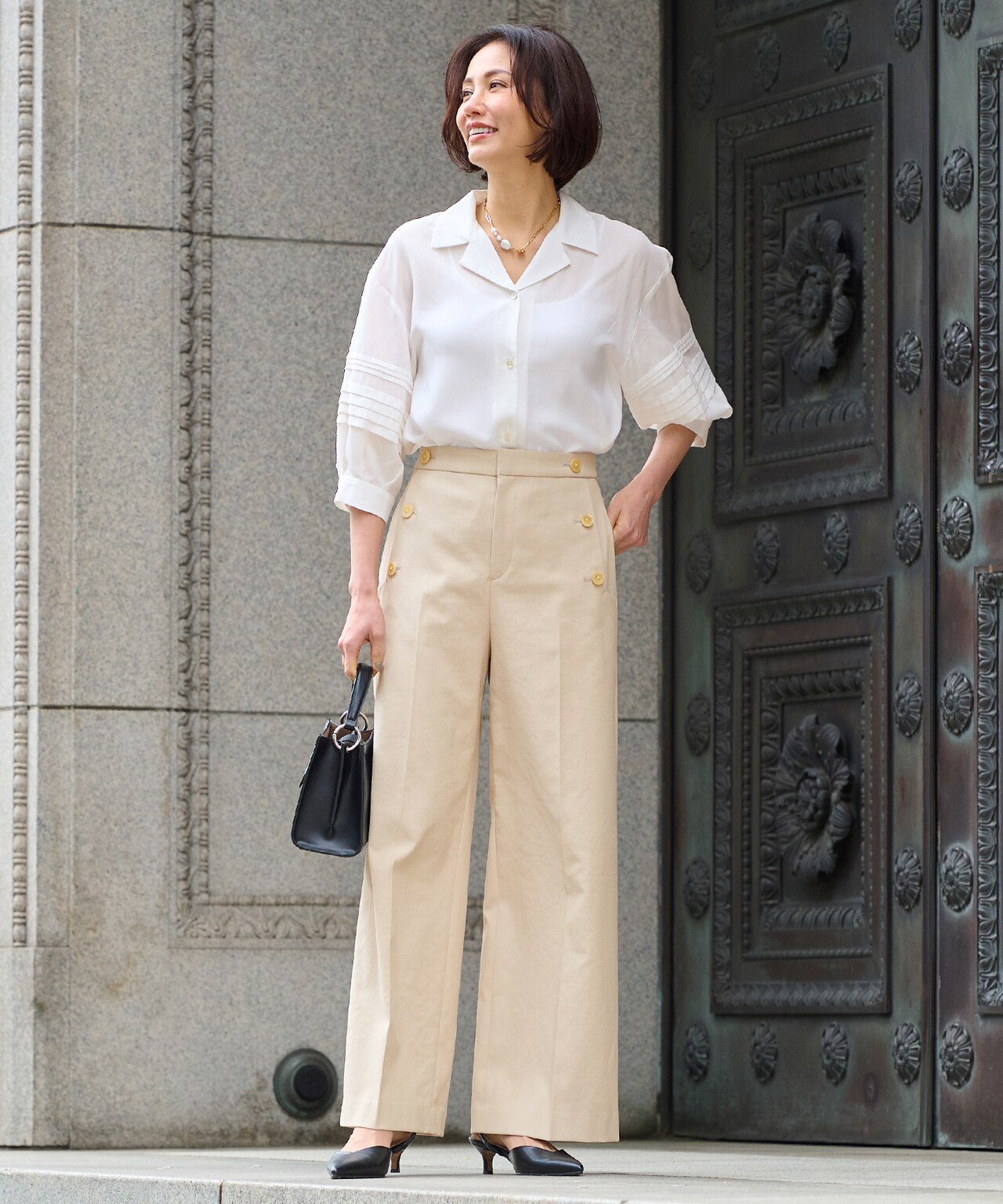 程よい太さのワイドパンツはWEB限定アイテム。ゆったりとしたシルエットでリラックス感があり、軽く滑らかな素材なので重たくならず、きれいめな印象に。
