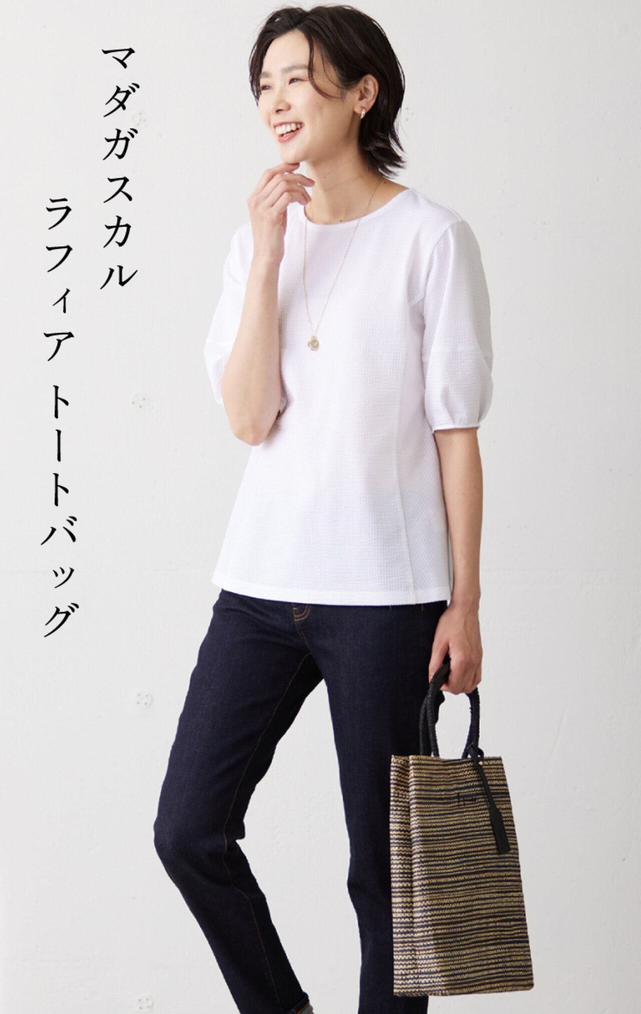 西インド洋の島国、マダガスカル島特産のラフィアシートを使用したトートバッグ。丁寧に手織りされたラフィア素材で、ボーダー、ストライプ、チェックなどバラエティに富んだ4タイプから選べる夏らしいデザイン。持ち手部分は手や腕にあたる部分が痛くならない様にフェイクレザーで巻き、A4サイズの書類が入る使いやすいサイズ。ナチュラルな雰囲気を残しつつも、フェイクレザーコンビできちんと感も。