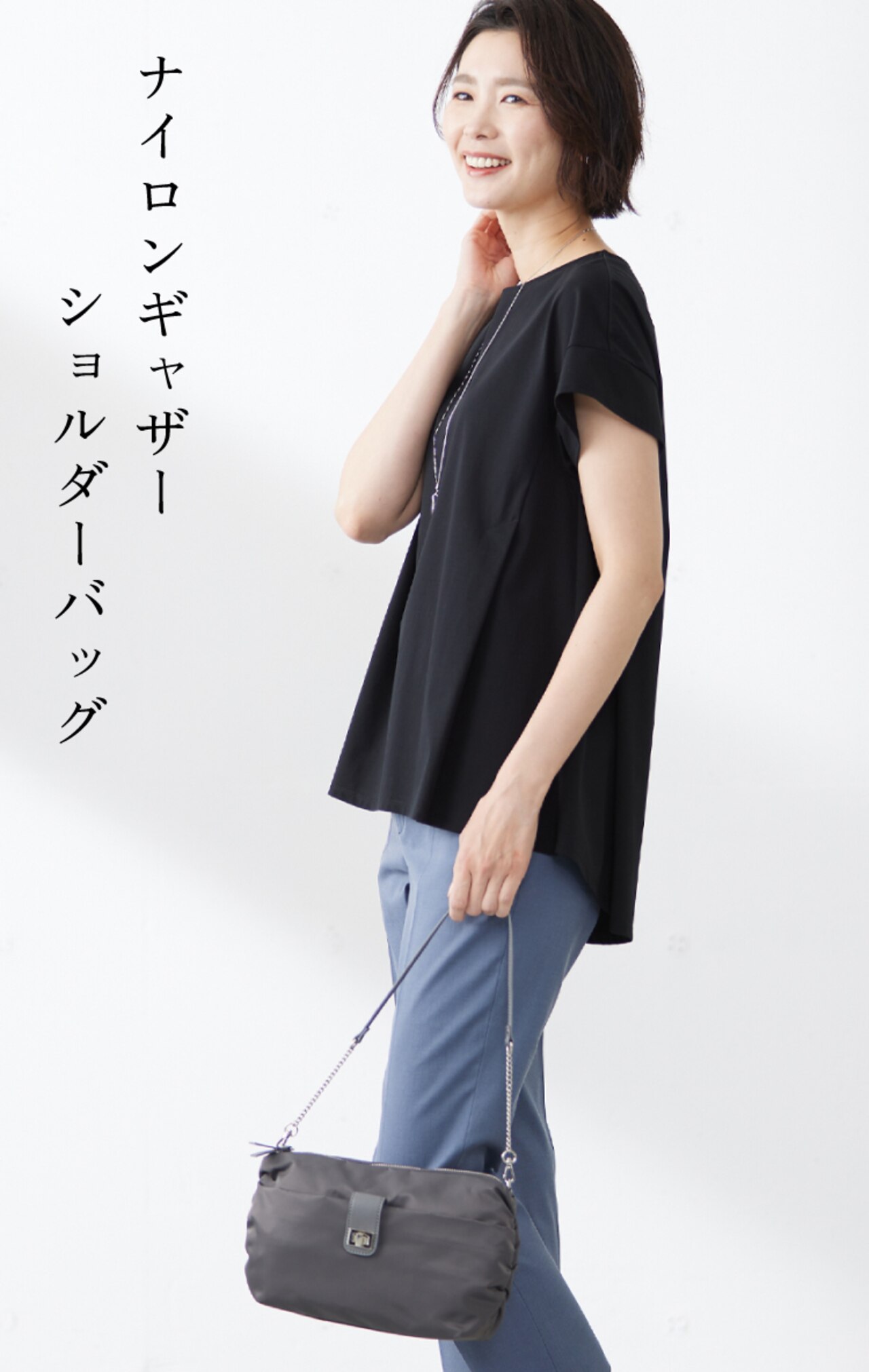 大人気のナイロンバッグに新色が登場!サイドにギャザーを施し、コロンとした丸みのあるシルエットが可愛いショルダーバッグ。部分使いチェーンの肩掛けショルダーと、ロングショルダーの2way仕様。フロントのメタル金具がポイントで、カジュアル過ぎず上品なデザイン。ナイロン素材でさっと拭き取れるので汚れてもお手入れしやすく、雨の日のお出かけバッグにも最適。