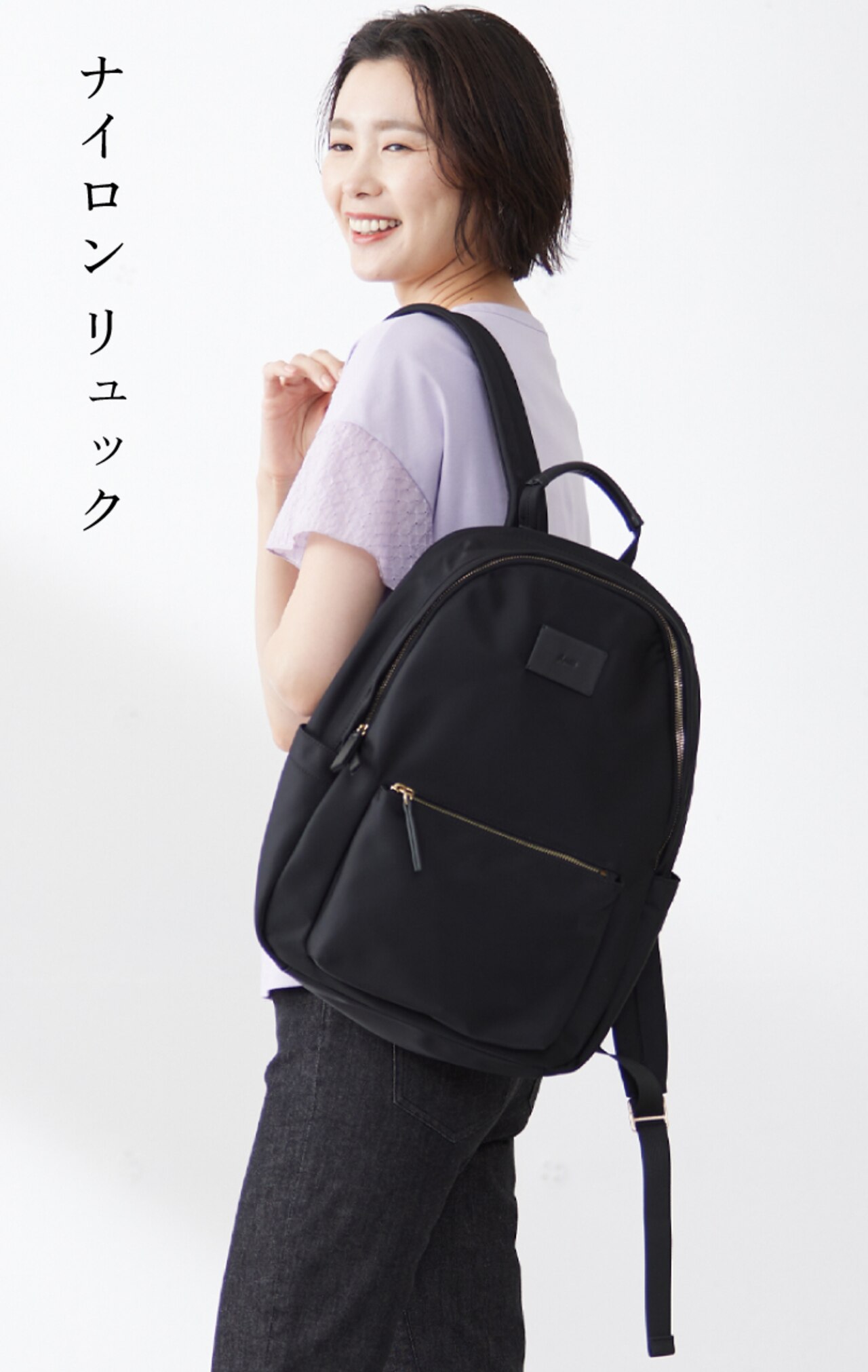 キレイめなデザインながら、機能性と収納力を兼ね備えたナイロンリュック。パソコンが収納できる背中側のポケットはファスナーがしっかり開き、ストレスフリーに出し入れ可能。背中側と肩が当たるショルダー部分にはクッション性の高い素材を使用、たくさん入るのに細かな荷物が整理でき、探しやすいのも嬉しいポイント。ナイロン素材で汚れてもお手入れしやすく、毎日の通勤やショッピング、ジムバッグなど様々なシーンでマルチに活躍。