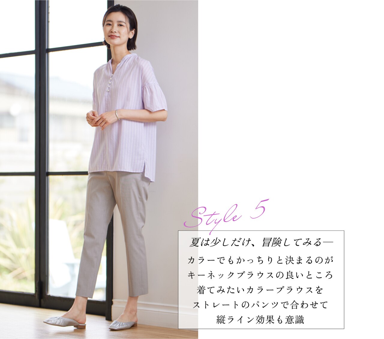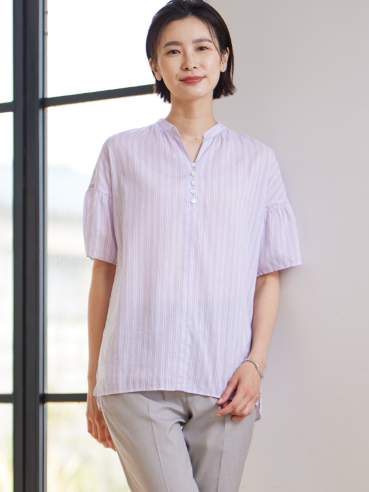 シアーストライプチェック フレンチスリーブ バンドカラー カットソー