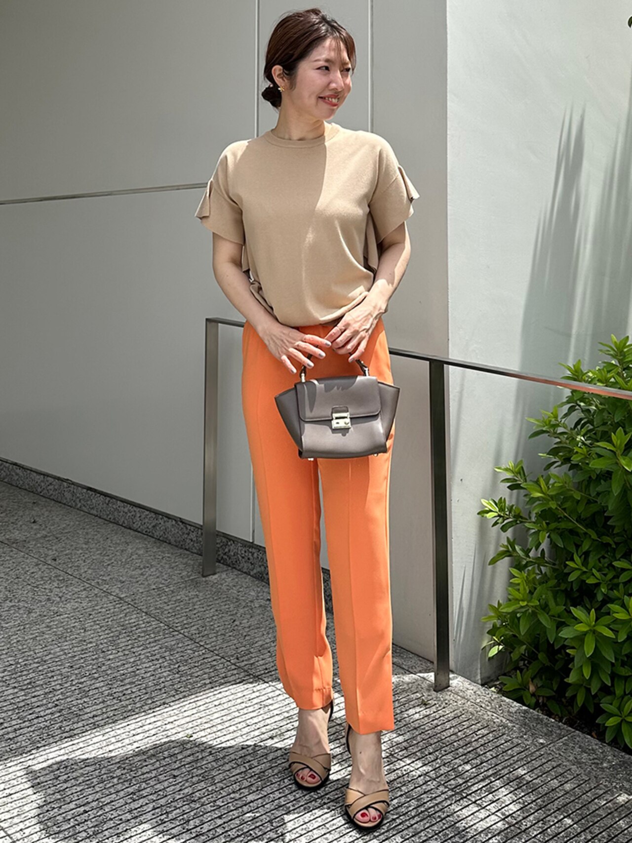 フレアスリーブが1枚で華やかなので、シンプルな合わせでも女性らしい印象に。(身長161㎝、Mサイズ)